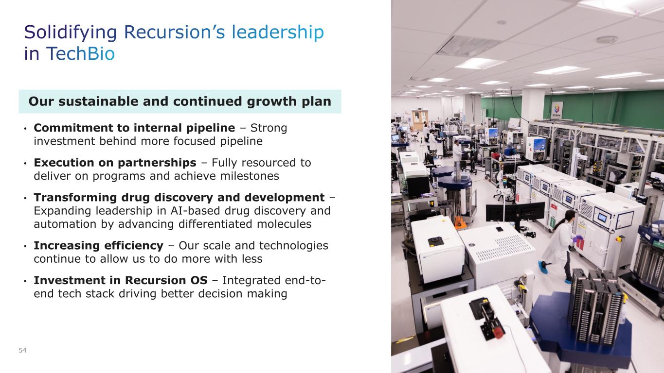 Our sustainable and continued growth plan • Commitment to internal pipeline – Strong investment behind more focused pipeline • Execution on partnerships – Fully resourced to deliver on programs and achieve milestones • Transforming drug discovery and development – Expanding leadership in AI-based drug discovery and automation by advancing differentiated molecules • Increasing efficiency – Our scale and technologies continue to allow us to do more with less • Investment in Recursion OS – Integrated end-to- end tech stack driving better decision making 54