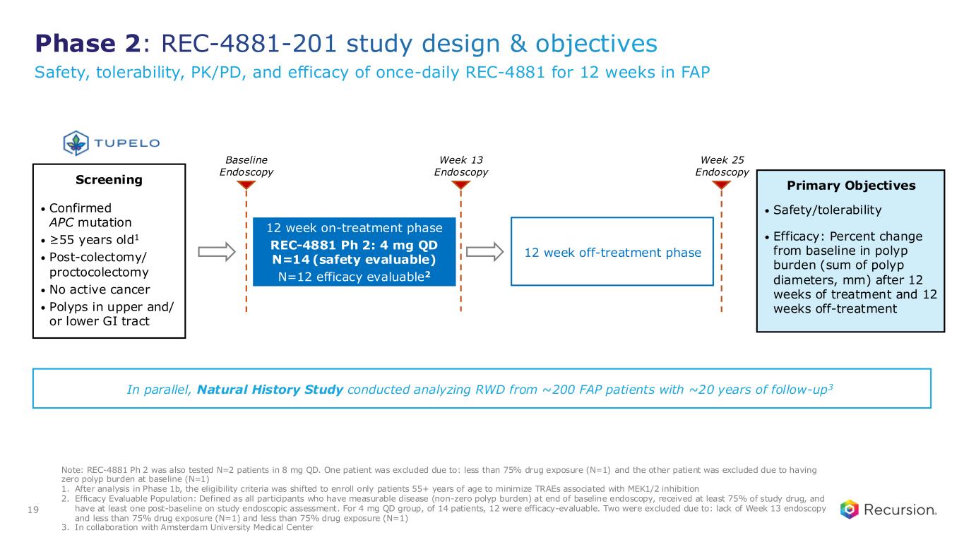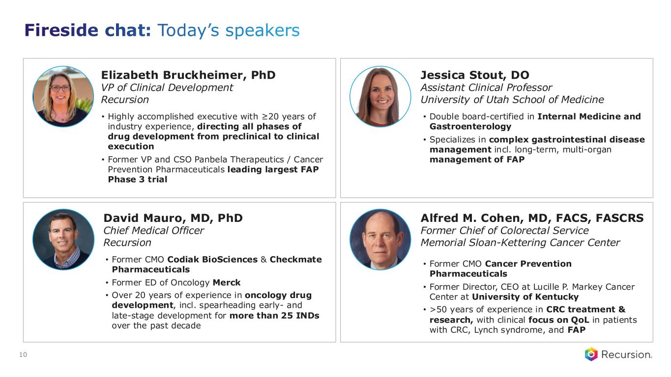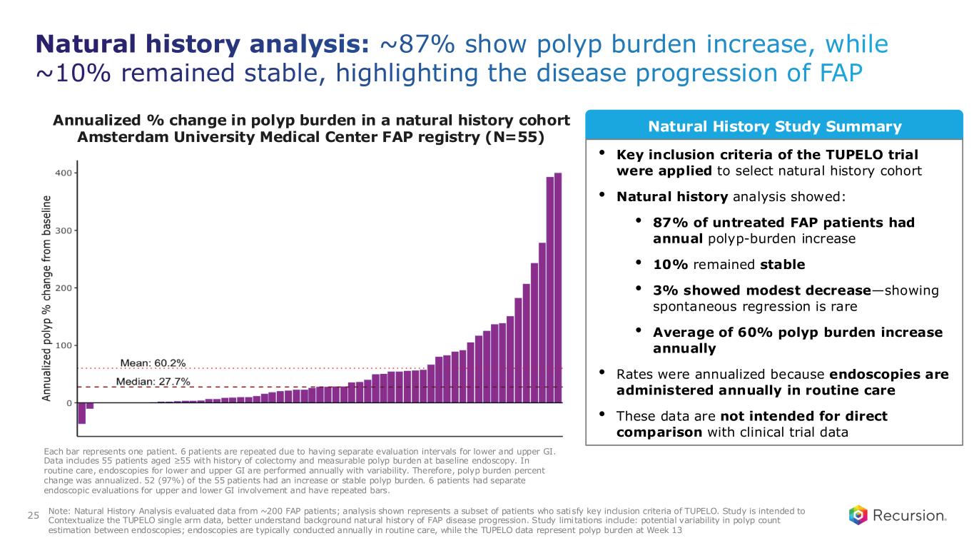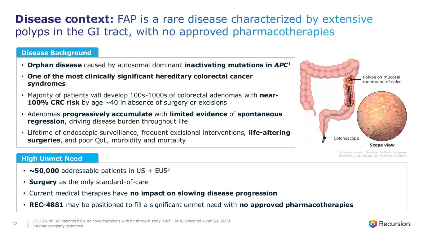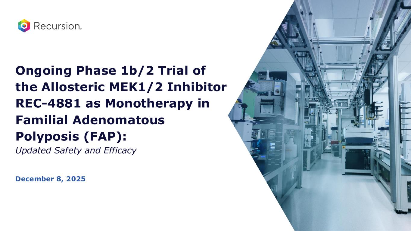 This presentation discusses an investigational product whose safety and efficacy have not been established. This document contains information that includes or is based upon “forward-looking statements” within the meaning of the Securities Litigation Reform Act of 1995, including, without limitation, those regarding Recursion’s anticipated engagement w ith the FDA; the clinical relevance of the TUPELO trial data and obtaining additional confirmatory data; advancing potential transformational therapies for FAP and beyond; subsequent REC-4881 studies, including expanded enrollment and alternate dosing schedule, and their results and advancing Recursion’s REC-4881 program further; the size of the potential FAP patient population; Recursion OS and other technologies potential and advancement of the future of medicine; business and financial plans and performance; and all other statements that are not historical facts. Forward-looking statements may or may not include identifying words such as “plan,” “will,” “expect,” “anticipate,” “intend,” “believe,” “potential,” “continue,” and similar terms. These statements are subject to known or unknown risks and uncertainties that could cause actual results to differ materially from those expressed or implied in such statements, including but not limited to: challenges inherent in pharmaceutical research and development, including the timing and results of preclinical and clinical programs, where the risk of failure is high and failure can occur at any stage prior to or after regulatory approval due to lack of sufficient efficacy, safety considerations, or other factors; our ability to leverage and enhance our drug discovery platform; our ability to obtain financing for development activities and other corporate purposes; the success of our collaboration activities; our ability to obtain regulatory approval of, and ultimately commercialize, drug candidates; our ability to obtain, maintain, and enforce intellectual property protections; cyberattacks or other disruptions to our technology systems; our ability to attract, motivate, and retain key employees and manage our growth; inflation and other macroeconomic issues; and other risks and uncertainties such as those described under the heading “Risk Factors” in our filings with the U.S. Securities and Exchange Commission, including our Annual Report on Form 10-K and Quarterly Reports on Form 10-Q. All forward-looking statements are based on management’s current estimates, projections, and assumptions, and Recursion undertakes no obligation to correct or update any such statements, whether as a result of new information, future developments, or otherwise, except to the extent required by applicable law. Forward Looking Statements