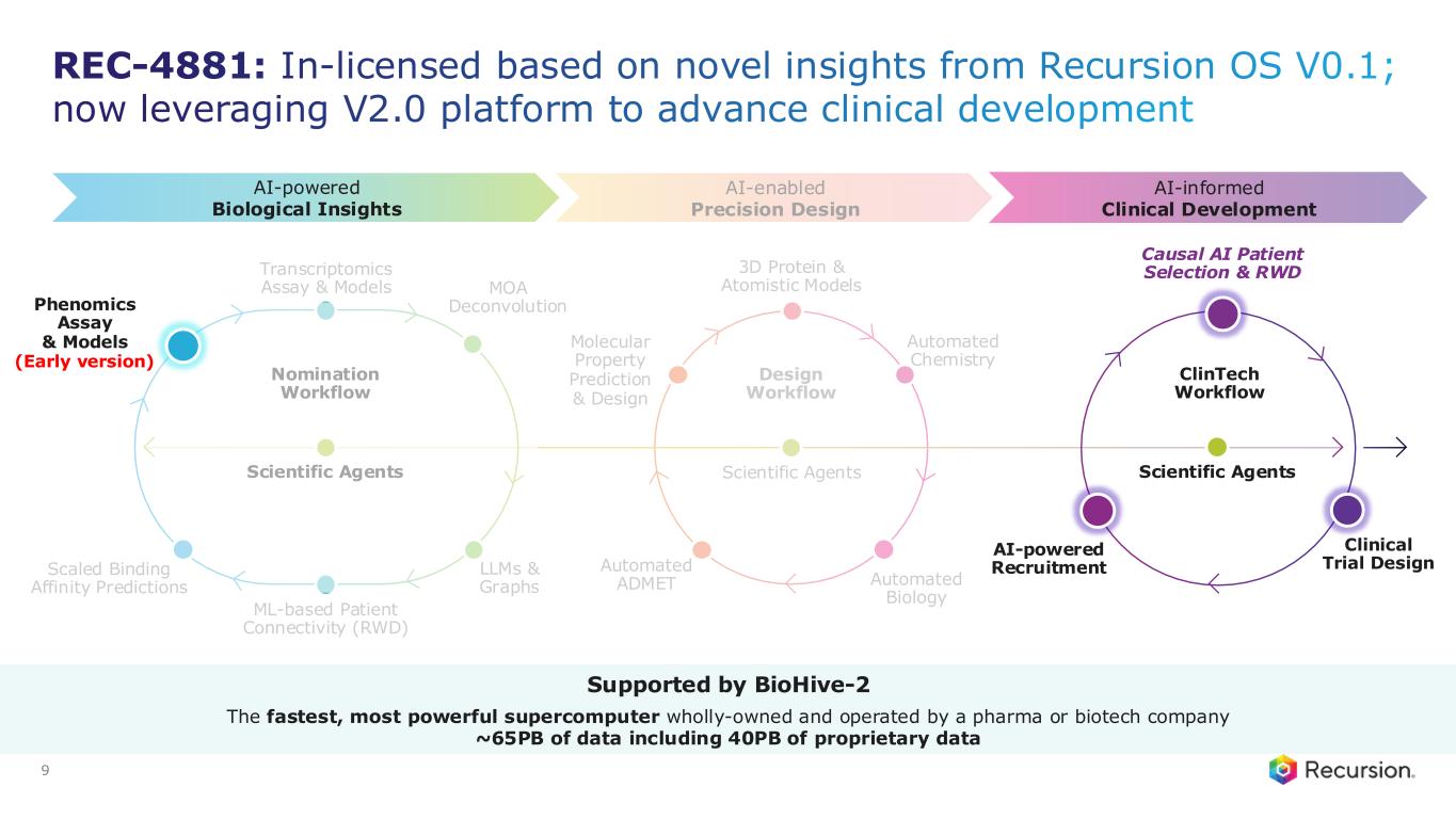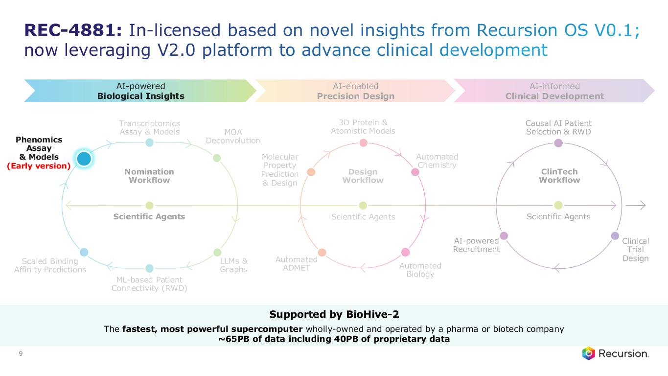 REC-4881: In-licensed based on novel insights from Recursion OS V0.1; now leveraging V2.0 platform to advance clinical development 9 Design Workflow Automated ADMET Automated Chemistry Automated Biology 3D Protein & Atomistic Models Molecular Property Prediction & Design Scientific Agents Transcriptomics Assay & Models ML-based Patient Connectivity (RWD) LLMs & Graphs MOA Deconvolution Scaled Binding Affinity Predictions AI-enabled Precision Design Clinical Trial Design ClinTech Workflow AI-powered Recruitment AI-informed Clinical Development Scientific Agents AI-powered Biological Insights Nomination Workflow Scientific Agents Supported by BioHive-2 The fastest, most powerful supercomputer wholly-owned and operated by a pharma or biotech company ~65PB of data including 40PB of proprietary data Causal AI Patient Selection & RWD Phenomics Assay & Models (Early version)