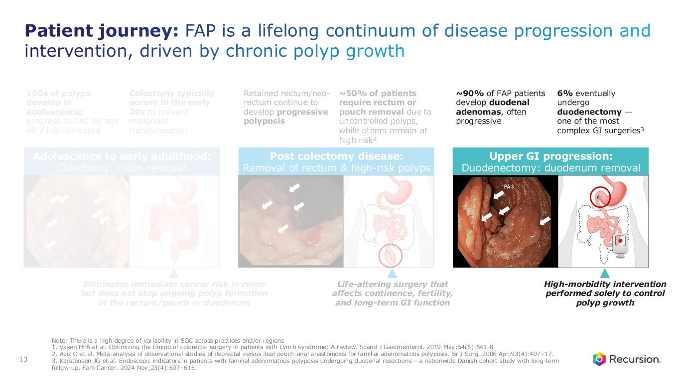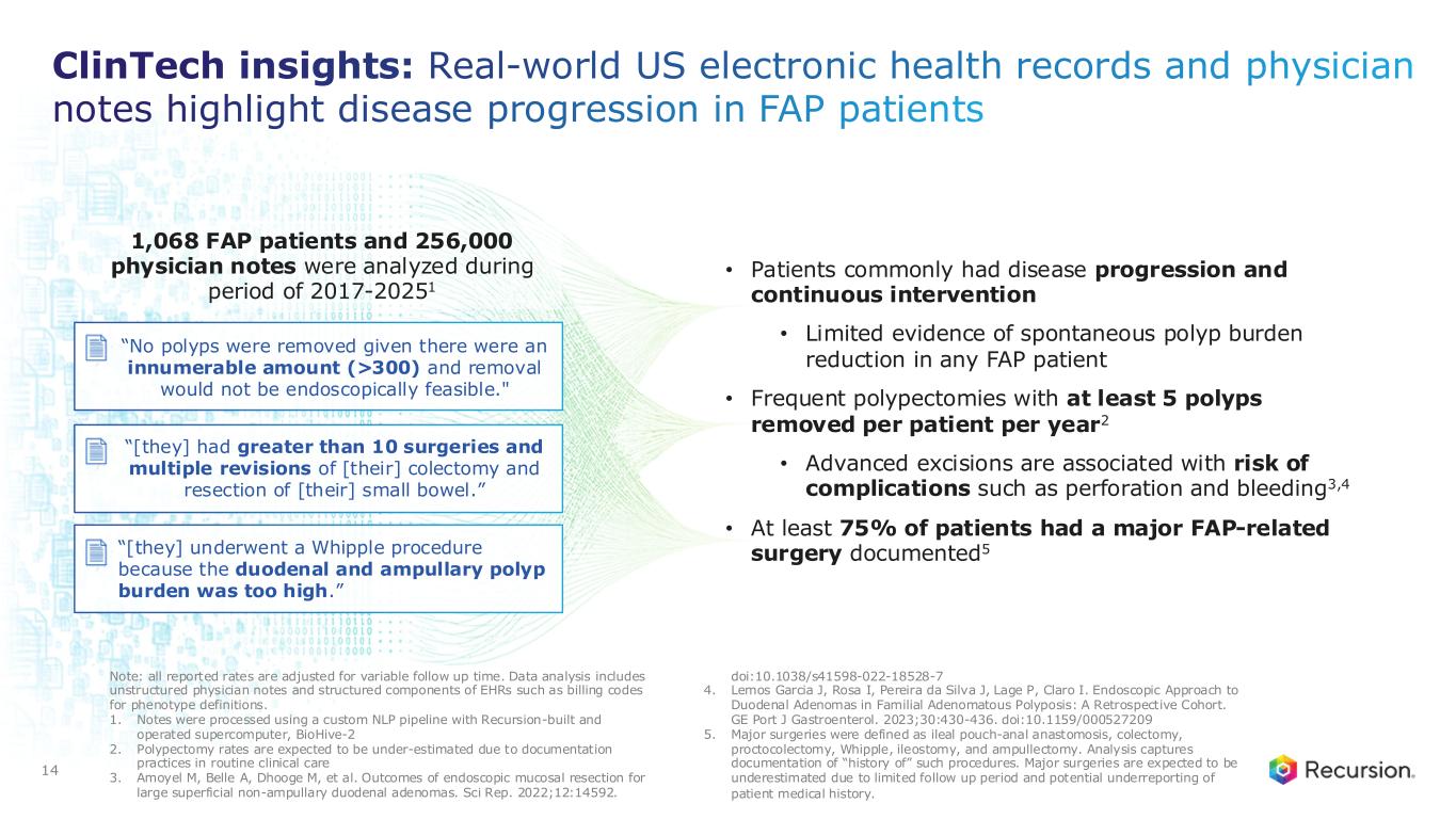 ClinTech insights: Real-world US electronic health records and physician notes highlight disease progression in FAP patients Note: all reported rates are adjusted for variable follow up time. Data analysis includes unstructured physician notes and structured components of EHRs such as billing codes for phenotype definitions. 1. Notes were processed using a custom NLP pipeline with Recursion-built and operated supercomputer, BioHive-2 2. Polypectomy rates are expected to be under-estimated due to documentation practices in routine clinical care 3. Amoyel M, Belle A, Dhooge M, et al. Outcomes of endoscopic mucosal resection for large superficial non-ampullary duodenal adenomas. Sci Rep. 2022;12:14592. doi:10.1038/s41598-022-18528-7 4. Lemos Garcia J, Rosa I, Pereira da Silva J, Lage P, Claro I. Endoscopic Approach to Duodenal Adenomas in Familial Adenomatous Polyposis: A Retrospective Cohort. GE Port J Gastroenterol. 2023;30:430-436. doi:10.1159/000527209 5. Major surgeries were defined as ileal pouch-anal anastomosis, colectomy, proctocolectomy, Whipple, ileostomy, and ampullectomy. Analysis captures documentation of “history of” such procedures. Major surgeries are expected to be underestimated due to limited follow up period and potential underreporting of patient medical history. 14 • Patients commonly had disease progression and continuous intervention • Limited evidence of spontaneous polyp burden reduction in any FAP patient • Frequent polypectomies with at least 5 polyps removed per patient per year2 • Advanced excisions are associated with risk of complications such as perforation and bleeding3,4 • At least 75% of patients had a major FAP-related surgery documented5 1,068 FAP patients and 256,000 physician notes were analyzed during period of 2017-20251 “No polyps were removed given there were an innumerable amount (>300) and removal would not be endoscopically feasible." “[they] had greater than 10 surgeries and multiple revisions of [their] colectomy and resection of [their] small bowel.” “[they] underwent a Whipple procedure because the duodenal and ampullary polyp burden was too high.”