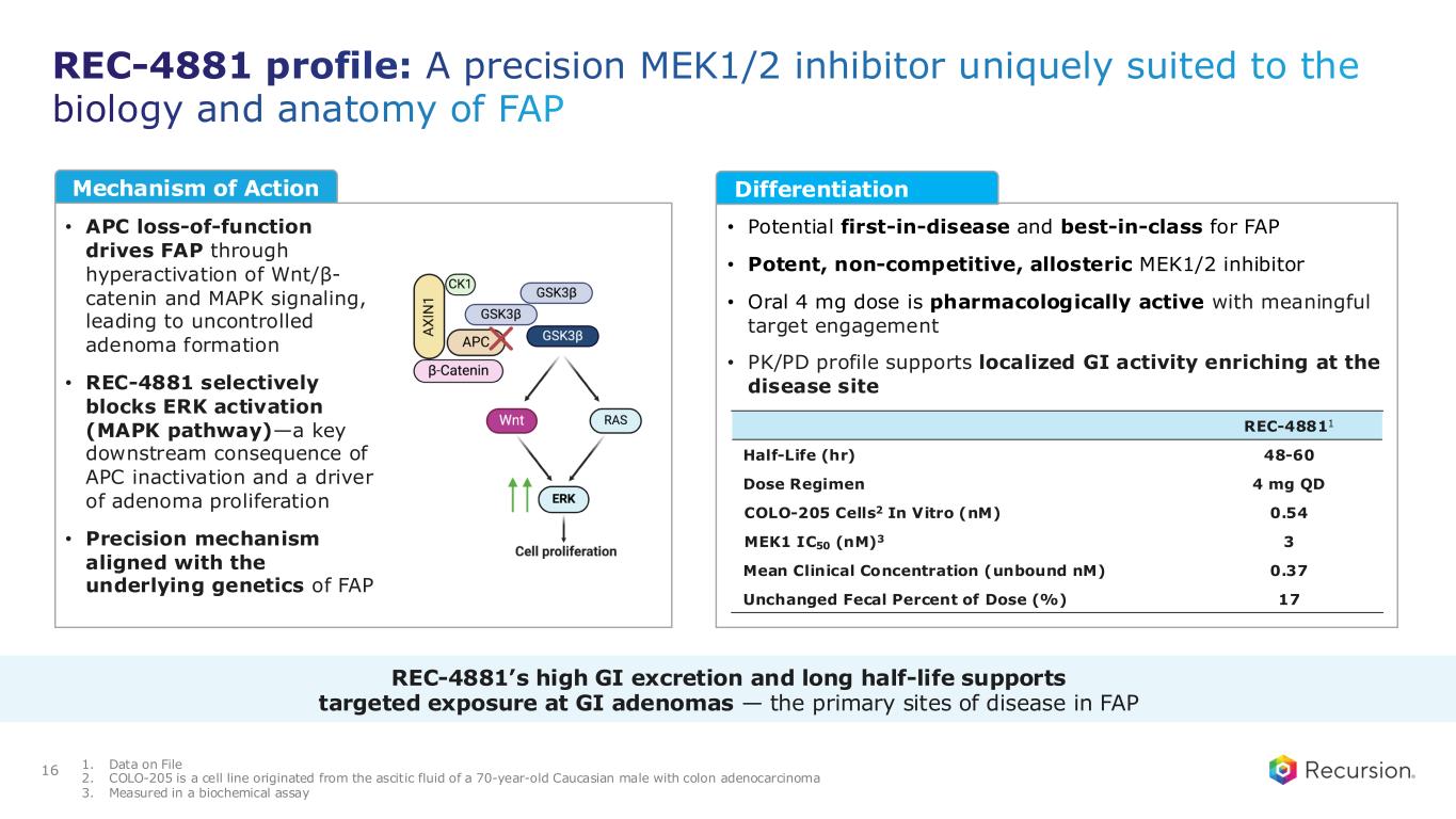 Platform insight: Unbiased AI-driven phenotypic discovery identified MEK1/2 inhibition as a novel APC-rescue mechanism, positioning REC-4881 for FAP • Platform screened thousands of compounds in APC mutant rescue assays • REC-4881 strongly clusters with APC rescue signature, indicating reversal of APC LoF induced phenotypes • Identified a novel, mechanistically grounded therapeutic entry point for FAP; a disease driven by APC inactivation Identified by phenotypic discovery platform to rescue APC LoF • In disease-model systems, REC-4881 shifts APC-mutant cells toward healthy-state biology • Demonstrates suppression of disease- inducing ERK/MAPK hyperactivation • Precision mechanism aligned with the underlying genetics of FAP REC-4881 suppresses disease- inducing effect of APC mutations • From 468 kinases, only 3 had inhibition >65% at 1 µM • No significant binding inhibition (>50%) across 71 receptors or ion channels at 10 µM • Selectivity profile supports a clean, targeted approach REC-4881 is a potent and selective allosteric MEK1/2 inhibitor REC-4881 Similar Opposite 15 Guided by this novel insight, Recursion in-licensed REC-4881 from a major pharmaceutical company1 and redirected REC-4881 as a mechanistically aligned therapeutic candidate for FAP 1. Recursion in-licensed REC-4881 from Takeda