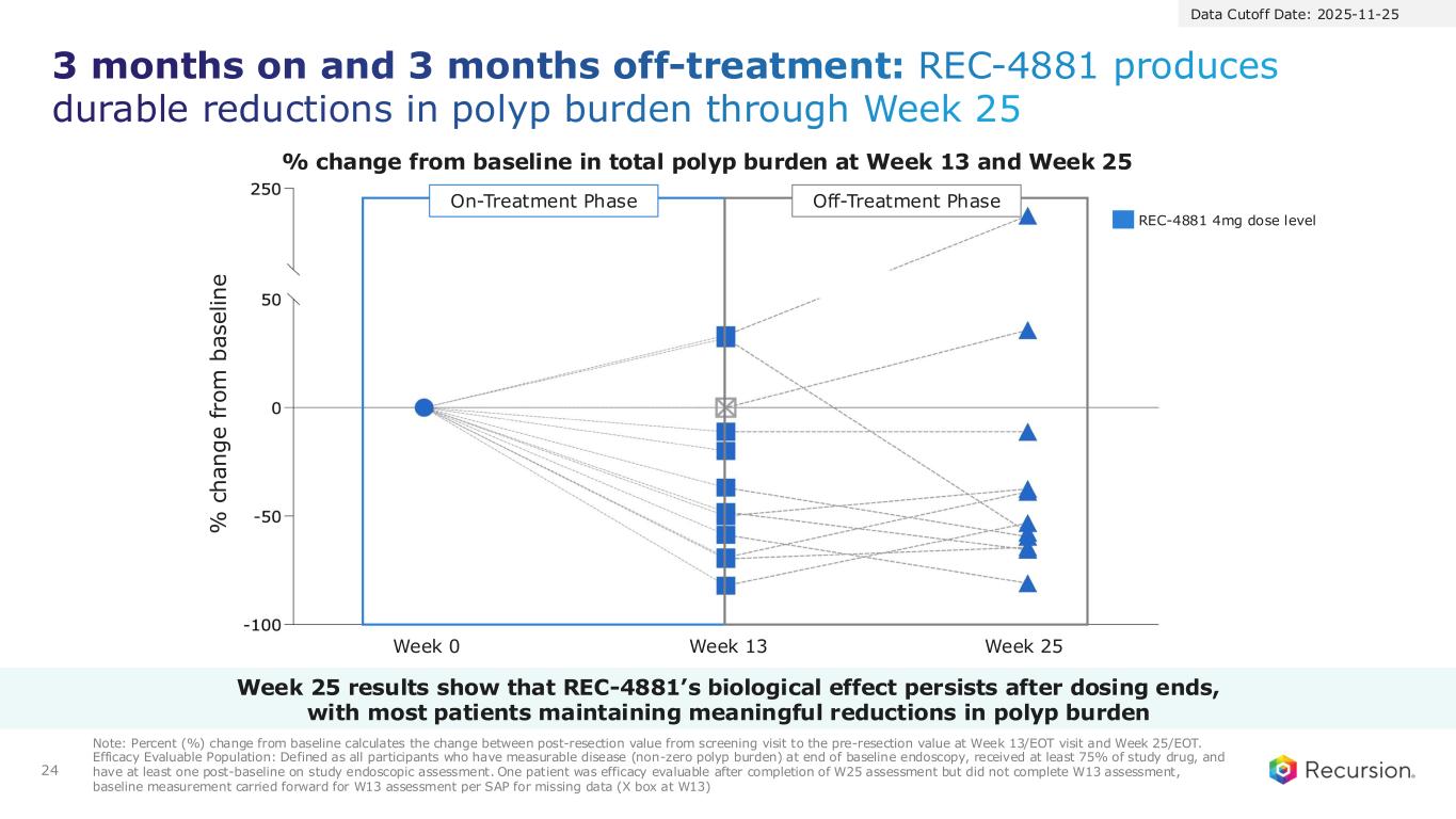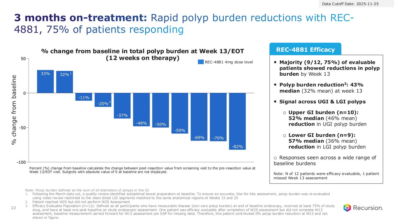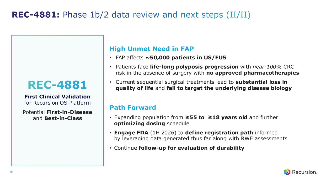 From platform discovery to positive clinical data: REC-4881’s emerging potential for treatment of familial adenomatous polyposis High Unmet Need in FAP • >50,000 patients in US/EU5 • Lifelong surveillance and life altering surgeries • No approved pharmacotherapy Safety Data Update • Most common TRAEs in line with MEK1/2 class effect (incl. dermatitis acneiform, CPK increase, rash) • Most Grade 1/2, low rates of Grade 3, no grade 4/5 First Platform to Clinical Proof of Concept • Recursion’s unbiased AI-driven phenotypic approach uncovered MEK1/2i as a mechanism that rescues APC-deficient cells • First to clinically investigate MEK1/2 inhibition for FAP Rapid Polyp Burden Reduction • Meaningful polyp reduction at 4 mg in majority of patients after 12 weeks of treatment Durable Polyp Burden Reduction • Significant polyp burden reduction maintained in most patients after 12 weeks off- treatment Path Forward • Engage FDA to define a potential registration path (1H 2026) • Expand population from ≥55 to 18 years old and further optimize dosing schedule