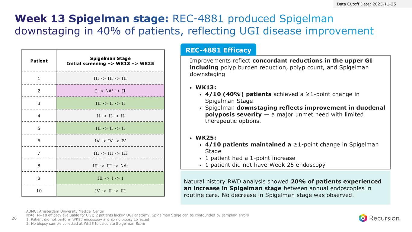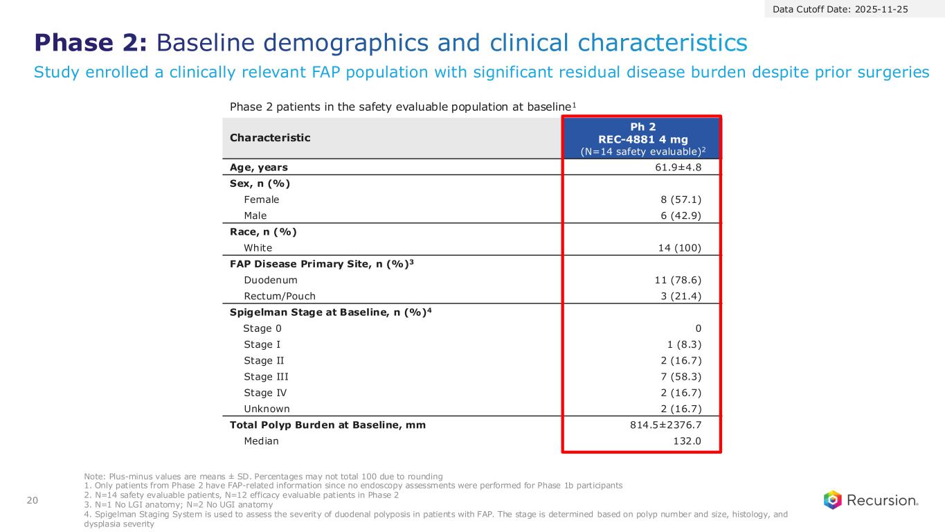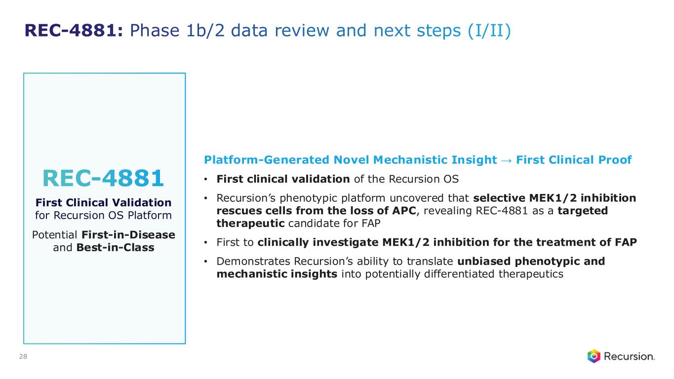 From platform discovery to positive clinical data: REC-4881’s emerging potential for treatment of familial adenomatous polyposis High Unmet Need in FAP • >50,000 patients in US/EU5 • Lifelong surveillance and life altering surgeries • No approved pharmacotherapy Safety Data Update • Most common TRAEs in line with MEK1/2 class effect (incl. dermatitis acneiform, CPK increase, rash) • Most Grade 1/2, low rates of Grade 3, no grade 4/5 First Platform to Clinical Proof of Concept • Recursion’s unbiased AI-driven phenotypic approach uncovered MEK1/2i as a mechanism that rescues APC-deficient cells • First to clinically investigate MEK1/2 inhibition for FAP Rapid Polyp Burden Reduction • Meaningful polyp reduction at 4 mg in majority of patients after 12 weeks of treatment Durable Polyp Burden Reduction • Significant polyp burden reduction maintained in most patients after 12 weeks off- treatment Path Forward • Engage FDA to define a potential registration path (1H 2026) • Expand population from ≥55 to 18 years old and further optimize dosing schedule