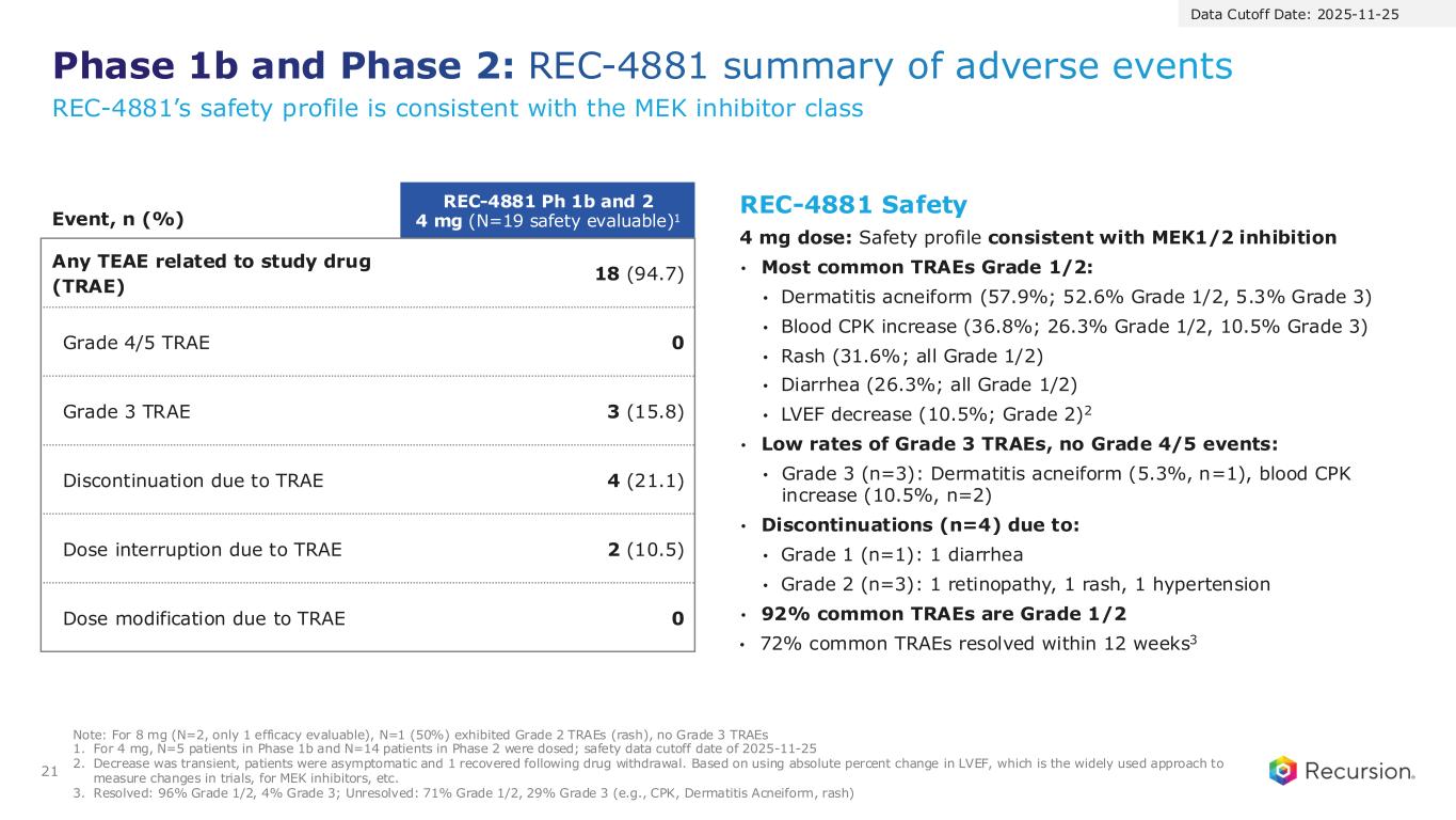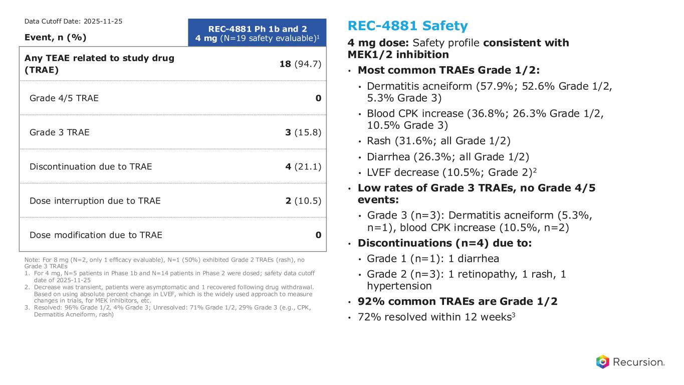 Event, n (%) REC-4881 Ph 1b and 2 4 mg (N=19 safety evaluable)1 Any TEAE related to study drug (TRAE) 18 (94.7) Grade 4/5 TRAE 0 Grade 3 TRAE 3 (15.8) Discontinuation due to TRAE 4 (21.1) Dose interruption due to TRAE 2 (10.5) Dose modification due to TRAE 0 REC-4881 Safety 4 mg dose: Safety profile consistent with MEK1/2 inhibition • Most common TRAEs Grade 1/2: • Dermatitis acneiform (57.9%; 52.6% Grade 1/2, 5.3% Grade 3) • Blood CPK increase (36.8%; 26.3% Grade 1/2, 10.5% Grade 3) • Rash (31.6%; all Grade 1/2) • Diarrhea (26.3%; all Grade 1/2) • LVEF decrease (10.5%; Grade 2)2 • Low rates of Grade 3 TRAEs, no Grade 4/5 events: • Grade 3 (n=3): Dermatitis acneiform (5.3%, n=1), blood CPK increase (10.5%, n=2) • Discontinuations (n=4) due to: • Grade 1 (n=1): 1 diarrhea • Grade 2 (n=3): 1 retinopathy, 1 rash, 1 hypertension • 92% common TRAEs are Grade 1/2 • 72% resolved within 12 weeks3 Data Cutoff Date: 2025-11-25 Note: For 8 mg (N=2, only 1 efficacy evaluable), N=1 (50%) exhibited Grade 2 TRAEs (rash), no Grade 3 TRAEs 1. For 4 mg, N=5 patients in Phase 1b and N=14 patients in Phase 2 were dosed; safety data cutoff date of 2025-11-25 2. Decrease was transient, patients were asymptomatic and 1 recovered following drug withdrawal. Based on using absolute percent change in LVEF, which is the widely used approach to measure changes in trials, for MEK inhibitors, etc. 3. Resolved: 96% Grade 1/2, 4% Grade 3; Unresolved: 71% Grade 1/2, 29% Grade 3 (e.g., CPK, Dermatitis Acneiform, rash)