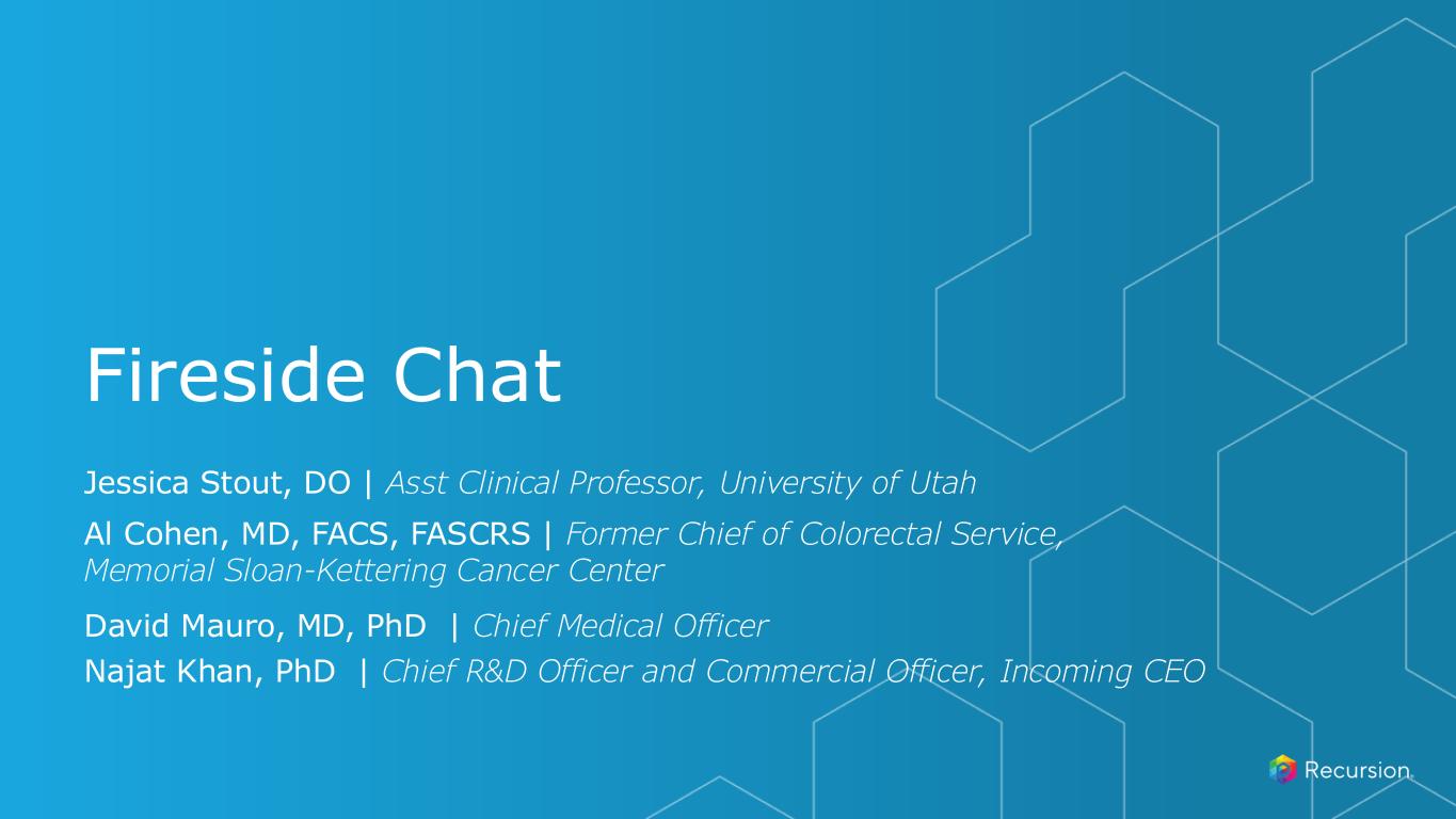 Fireside Chat Najat Khan, PhD | Chief R&D Officer and Commercial Officer, Incoming CEO Jessica Stout, DO | Asst Clinical Professor, University of Utah Al Cohen, MD, FACS, FASCRS | Former Chief of Colorectal Service, Memorial Sloan-Kettering Cancer Center David Mauro, MD, PhD | Chief Medical Officer