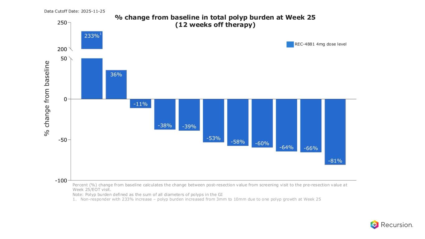 Percent (%) change from baseline calculates the change between post-resection value from screening visit to the pre-resection value at Week 13/EOT visit. Subjects with absolute value of 0 at baseline are not displayed. Note: Polyp burden defined as the sum of all diameters of polyps in the GI 1. Following the March data cut, a quality review identified suboptimal bowel preparation at baseline. To ensure an accurate, like-for-like assessment, polyp burden was re-evaluated using video review restricted to the clean distal LGI segments matched to the same anatomical regions at Weeks 13 and 25 2. Patient reached W25 but did not perform W25 Assessment REC-4881 4mg dose level % change from baseline in total polyp burden at Week 13/EOT (12 weeks on therapy) % c h a n g e f ro m b a s e li n e 1 2 Data Cutoff Date: 2025-11-25