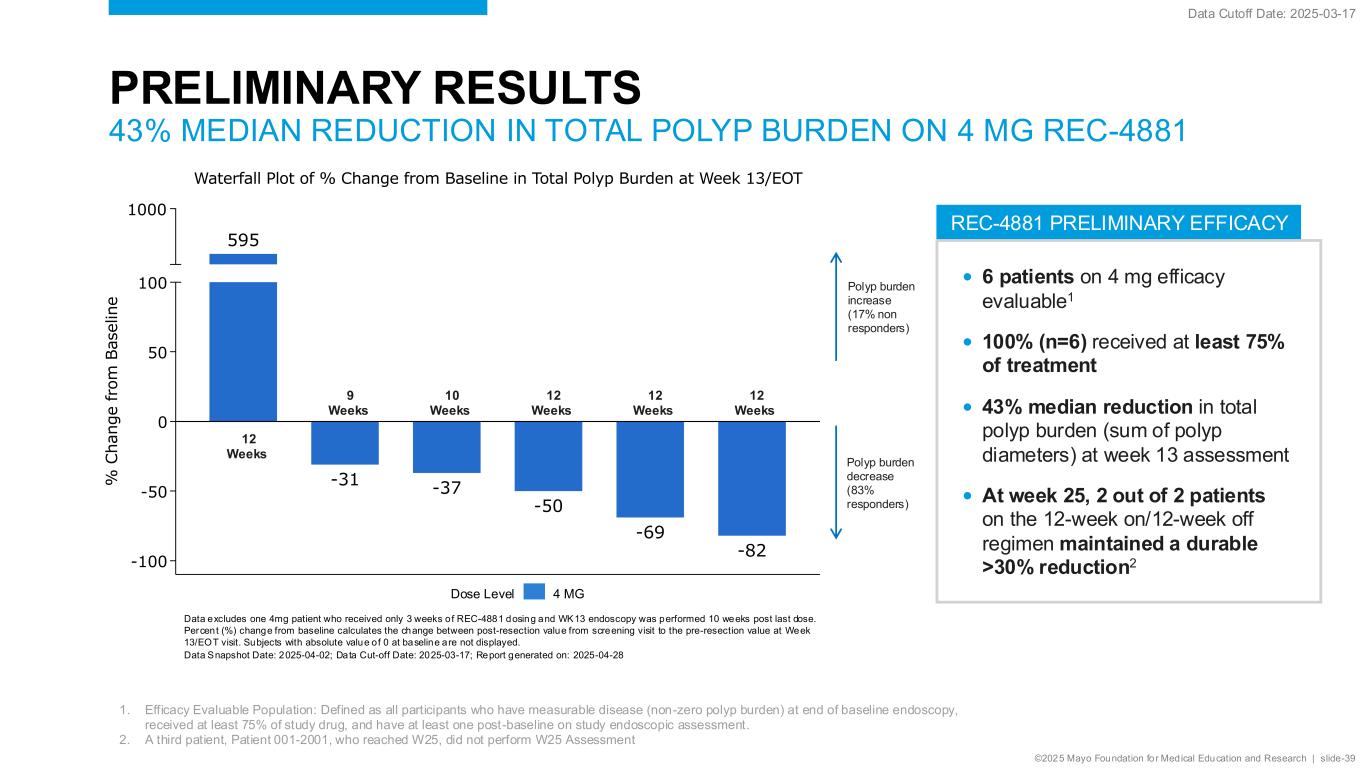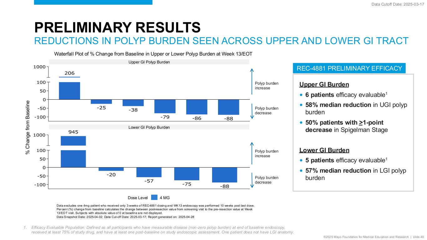 ©2025 Mayo Foundation for Medical Education and Research | slide-39 REC-4881 PRELIMINARY EFFICACY PRELIMINARY RESULTS 43% MEDIAN REDUCTION IN TOTAL POLYP BURDEN ON 4 MG REC-4881 • 6 patients on 4 mg efficacy evaluable1 • 100% (n=6) received at least 75% of treatment • 43% median reduction in total polyp burden (sum of polyp diameters) at week 13 assessment • At week 25, 2 out of 2 patients on the 12-week on/12-week off regimen maintained a durable >30% reduction2 1. Efficacy Evaluable Population: Defined as all participants who have measurable disease (non-zero polyp burden) at end of baseline endoscopy, received at least 75% of study drug, and have at least one post-baseline on study endoscopic assessment. 2. A third patient, Patient 001-2001, who reached W25, did not perform W25 Assessment Data Cutoff Date: 2025-03-17 Polyp burden increase (17% non responders) Polyp burden decrease (83% responders) 12 Weeks 9 Weeks 10 Weeks 12 Weeks 12 Weeks 12 Weeks 595 -31 -37 -50 -69 -82 -100 -50 0 50 100 1000 % C h a n g e f ro m B a s e li n e Waterfall Plot of % Change from Baseline in Total Polyp Burden at Week 13/EOT Data excludes one 4mg patient who received only 3 weeks of REC-4881 dosing and WK13 endoscopy was performed 10 weeks post last dose. Percent (%) change from baseline calculates the change between post-resection value from screening visit to the pre-resection value at Week 13/EOT visit. Subjects with absolute value of 0 at baseline are not displayed. Data Snapshot Date: 2025-04-02; Data Cut-off Date: 2025-03-17; Report generated on: 2025-04-28 Dose Level 4 MG