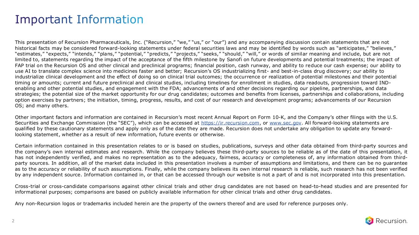 This presentation of Recursion Pharmaceuticals, Inc. (“Recursion,” “we,” “us,” or “our”) and any accompanying discussion contain statements that are not historical facts may be considered forward-looking statements under federal securities laws and may be identified by words such as “anticipates,” “believes,” “estimates,” “expects,” “intends,” “plans,” “potential,” “predicts,” “projects,” “seeks,” “should,” “will,” or words of similar meaning and include, but are not limited to, statements regarding the impact of the acceptance of the fifth milestone by Sanofi on future developments and potential treatments; the impact of FAP trial on the Recursion OS and other clinical and preclinical programs; financial position, cash runway, and ability to reduce our cash expense; our ability to use AI to translate complex science into medicines faster and better; Recursion’s OS industrializing first- and best-in-class drug discovery; our ability to industrialize clinical development and the effect of doing so on clinical trial outcomes; the occurrence or realization of potential milestones and their potential timing or amounts; current and future preclinical and clinical studies, including timelines for enrollment in studies, data readouts, progression toward IND- enabling and other potential studies, and engagement with the FDA; advancements of and other decisions regarding our pipeline, partnerships, and data strategies; the potential size of the market opportunity for our drug candidates; outcomes and benefits from licenses, partnerships and collaborations, including option exercises by partners; the initiation, timing, progress, results, and cost of our research and development programs; advancements of our Recursion OS; and many others. Other important factors and information are contained in Recursion’s most recent Annual Report on Form 10-K, and the Company’s other filings with the U.S. Securities and Exchange Commission (the “SEC”), which can be accessed at https://ir.recursion.com, or www.sec.gov. All forward-looking statements are qualified by these cautionary statements and apply only as of the date they are made. Recursion does not undertake any obligation to update any forward- looking statement, whether as a result of new information, future events or otherwise. Certain information contained in this presentation relates to or is based on studies, publications, surveys and other data obtained from third-party sources and the company’s own internal estimates and research. While the company believes these third-party sources to be reliable as of the date of this presentation, it has not independently verified, and makes no representation as to the adequacy, fairness, accuracy or completeness of, any information obtained from third- party sources. In addition, all of the market data included in this presentation involves a number of assumptions and limitations, and there can be no guarantee as to the accuracy or reliability of such assumptions. Finally, while the company believes its own internal research is reliable, such research has not been verified by any independent source. Information contained in, or that can be accessed through our website is not a part of and is not incorporated into this presentation. Cross-trial or cross-candidate comparisons against other clinical trials and other drug candidates are not based on head-to-head studies and are presented for informational purposes; comparisons are based on publicly available information for other clinical trials and other drug candidates. Any non-Recursion logos or trademarks included herein are the property of the owners thereof and are used for reference purposes only. Important Information 2