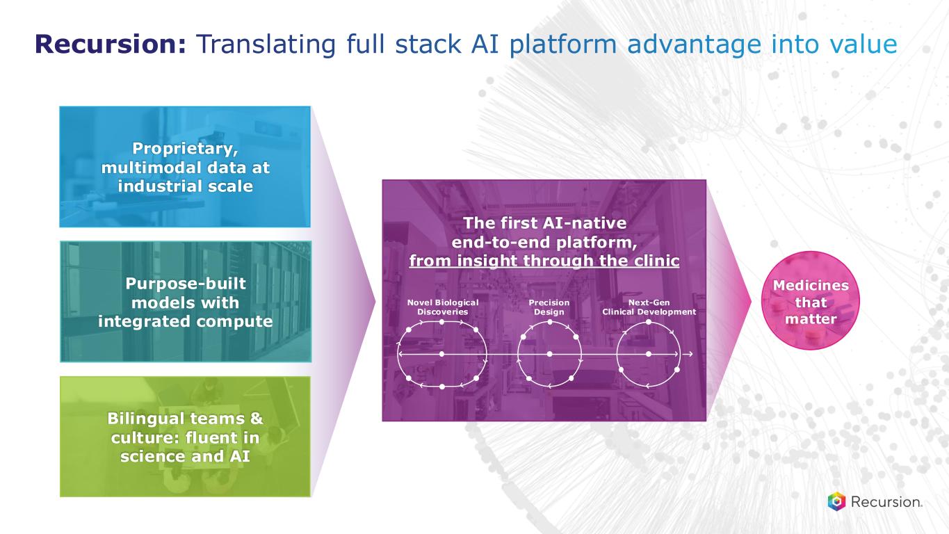 The first AI-native end-to-end platform, from insight through the clinic Precision Design Novel Biological Discoveries Next-Gen Clinical Development Bilingual teams & culture: fluent in science and AI Purpose-built models with integrated compute Proprietary, multimodal data at industrial scale Recursion: Translating full stack AI platform advantage into value Medicines that matter