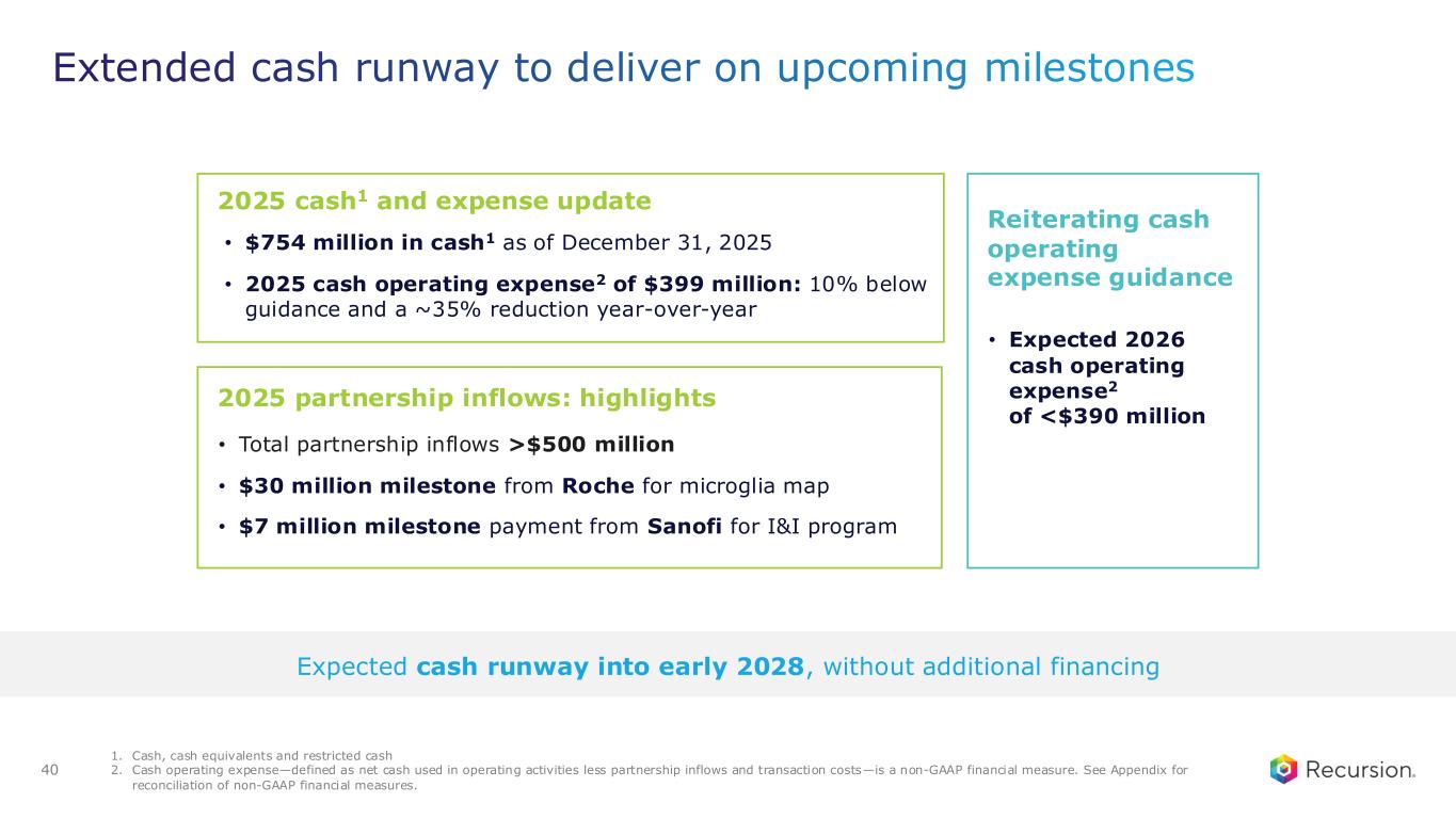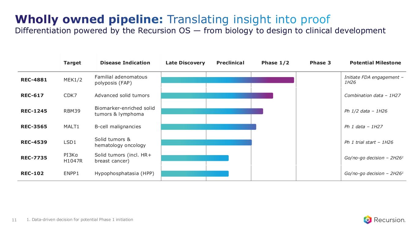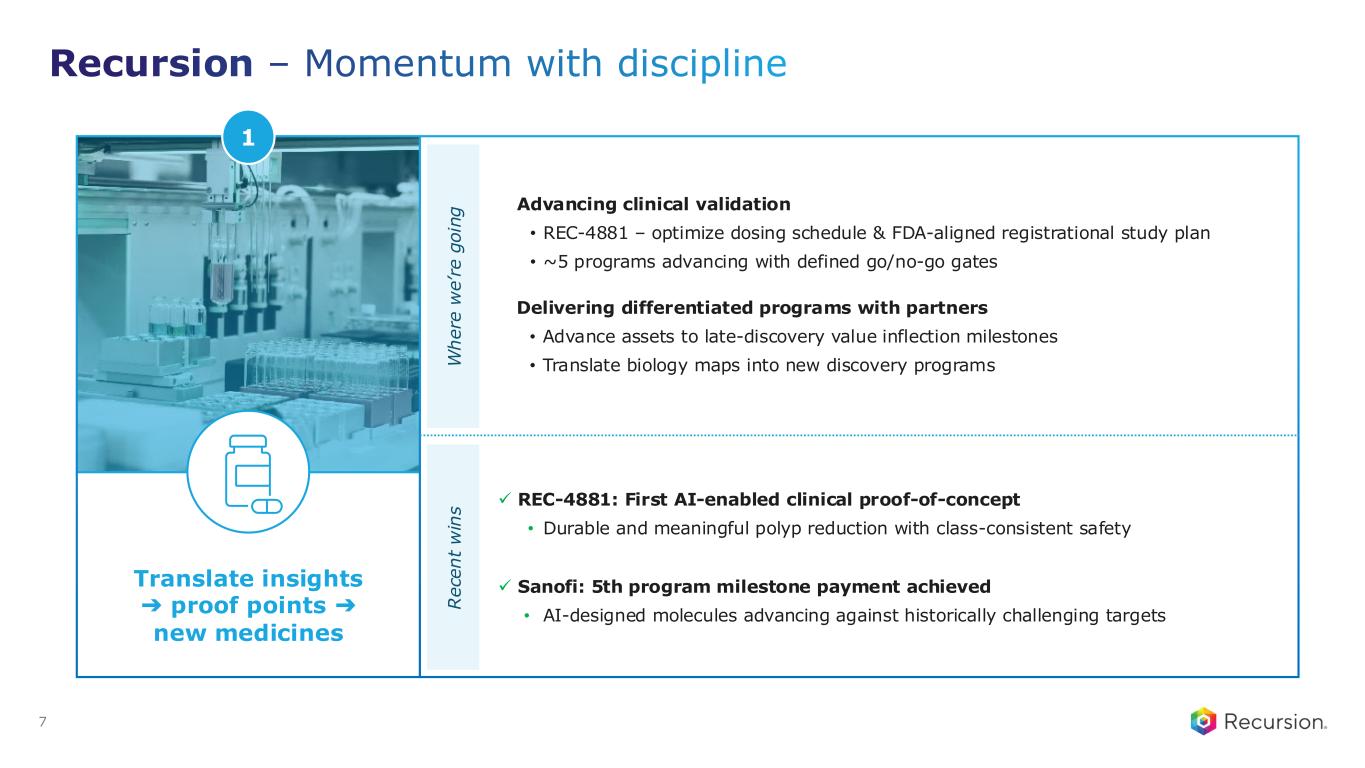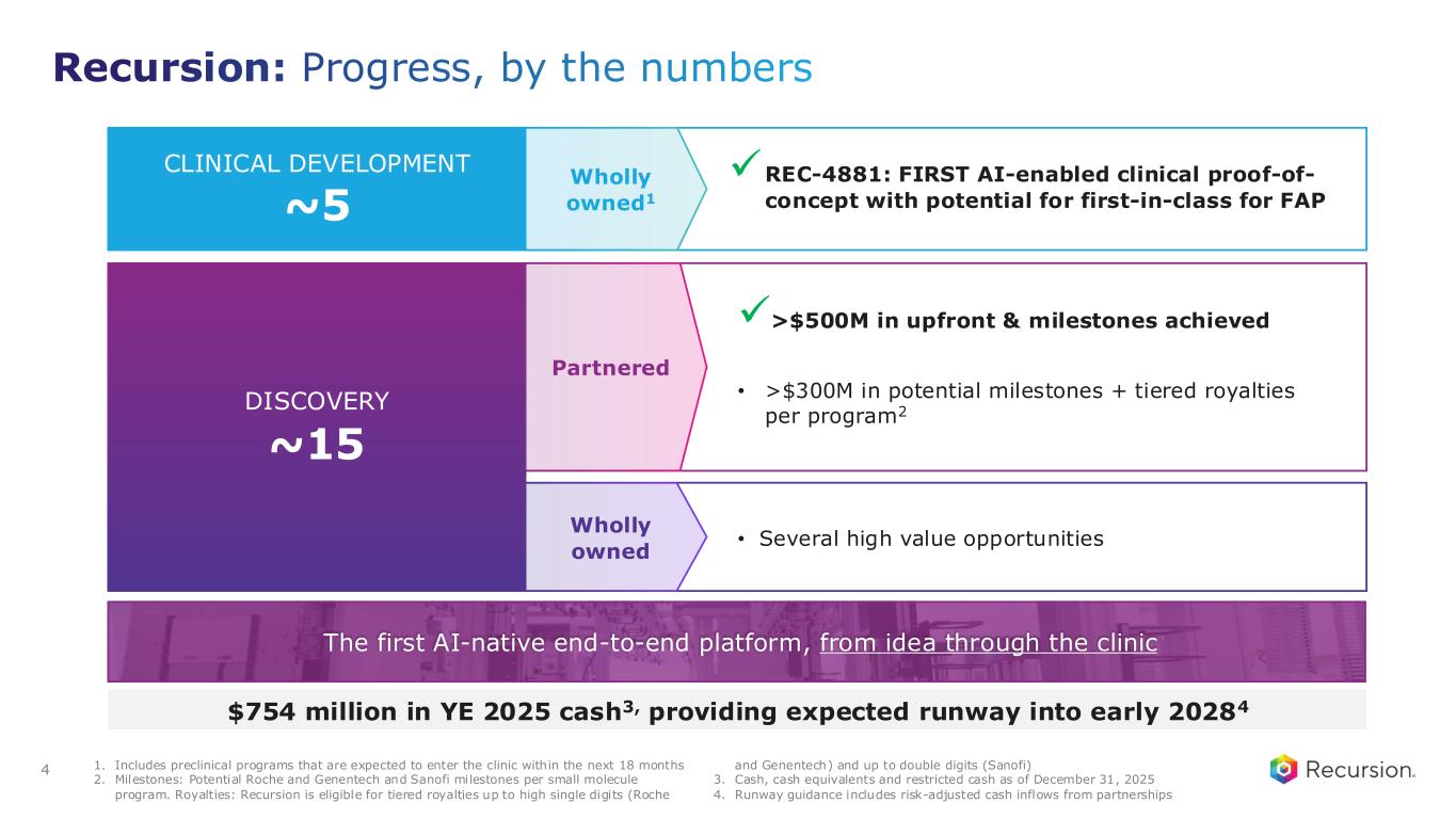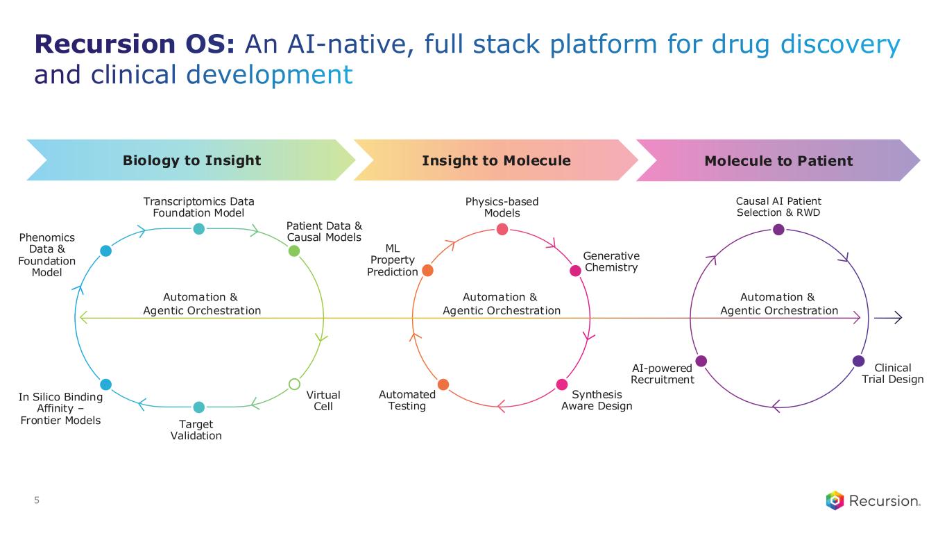 1. Includes preclinical programs that are expected to enter the clinic within the next 18 months 2. Milestones: Potential Roche and Genentech and Sanofi milestones per small molecule program. Royalties: Recursion is eligible for tiered royalties up to high single digits (Roche and Genentech) and up to double digits (Sanofi) 3. Cash, cash equivalents and restricted cash as of December 31, 2025 4. Runway guidance includes risk-adjusted cash inflows from partnerships Recursion: Progress, by the numbers Wholly owned1~5 CLINICAL DEVELOPMENT ✓REC-4881: FIRST AI-enabled clinical proof-of- concept with potential for first-in-class for FAP ✓>$500M in upfront & milestones achieved • >$300M in potential milestones + tiered royalties per program2 • Several high value opportunities Partnered Wholly owned ~15 DISCOVERY The first AI-native end-to-end platform, from idea through the clinic $754 million in YE 2025 cash3, providing expected runway into early 20284 4