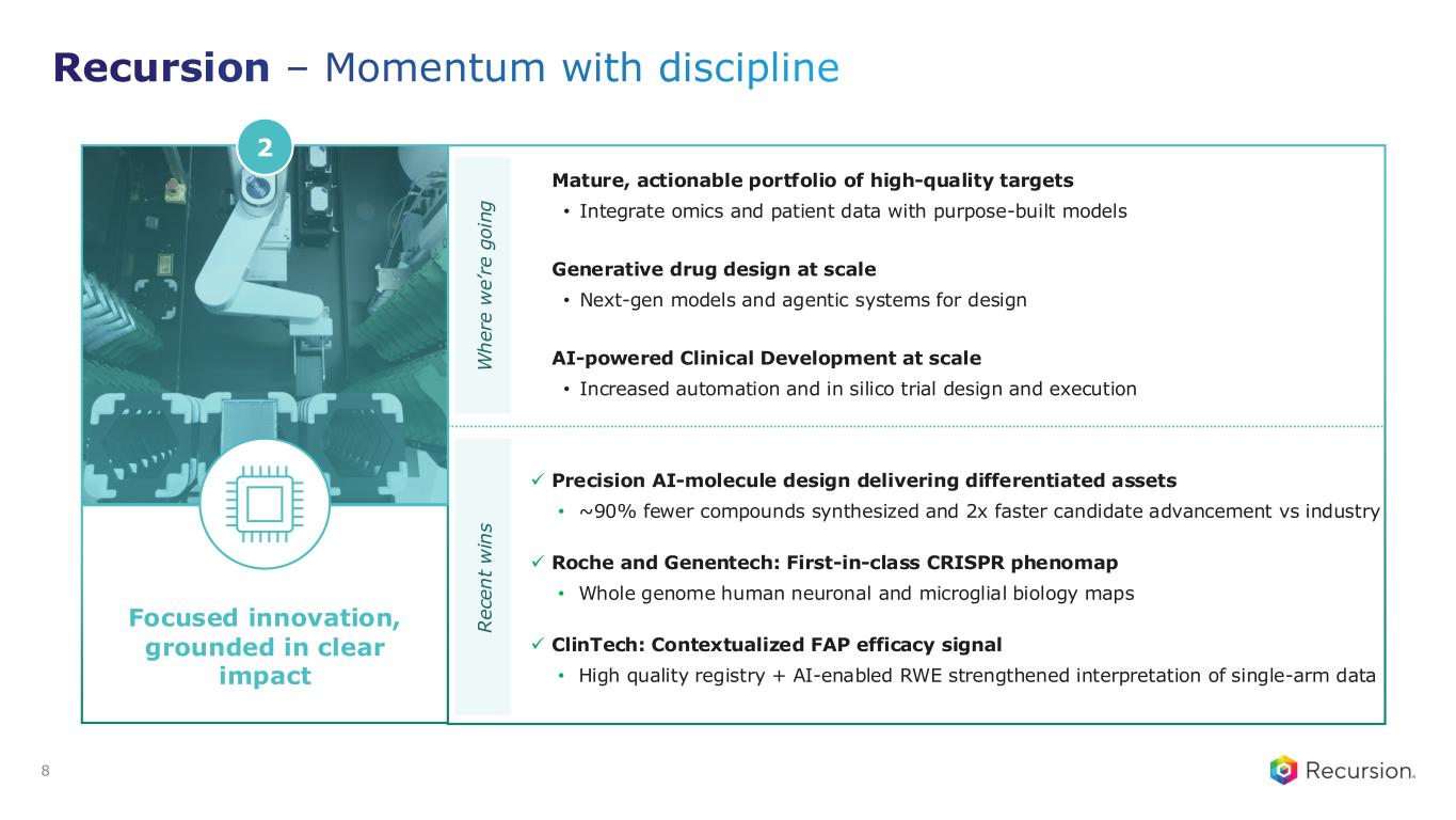 Recursion – Momentum with discipline 7 Advancing clinical validation • REC-4881 – optimize dosing schedule & FDA-aligned registrational study plan • ~5 programs advancing with defined go/no-go gates Delivering differentiated programs with partners • Advance assets to late-discovery value inflection milestones • Translate biology maps into new discovery programsW h e re w e ’r e g o in g ✓ REC-4881: First AI-enabled clinical proof-of-concept • Durable and meaningful polyp reduction with class-consistent safety ✓ Sanofi: 5th program milestone payment achieved • AI-designed molecules advancing against historically challenging targets R e ce n t w in s Translate insights ➔ proof points ➔ new medicines 1