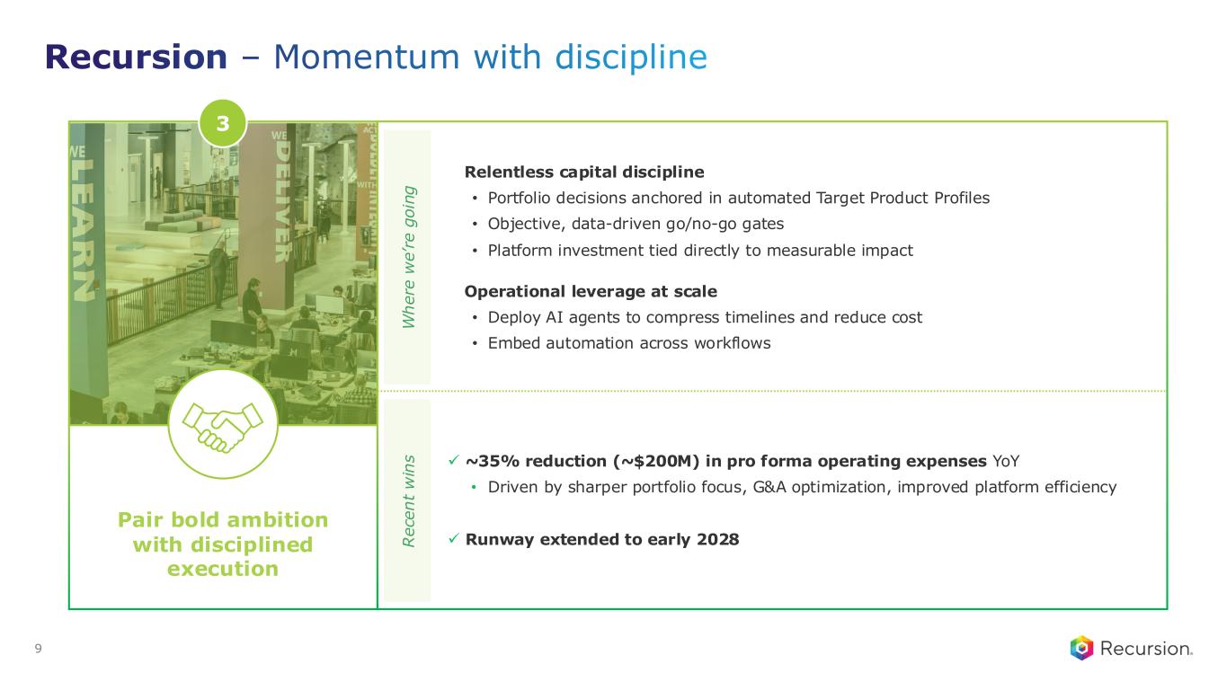 Recursion – Momentum with discipline 8 W h e re w e ’r e g o in g R e ce n t w in s ✓ Precision AI-molecule design delivering differentiated assets • ~90% fewer compounds synthesized and 2x faster candidate advancement vs industry ✓ Roche and Genentech: First-in-class CRISPR phenomap • Whole genome human neuronal and microglial biology maps ✓ ClinTech: Contextualized FAP efficacy signal • High quality registry + AI-enabled RWE strengthened interpretation of single-arm data Mature, actionable portfolio of high-quality targets • Integrate omics and patient data with purpose-built models Generative drug design at scale • Next-gen models and agentic systems for design AI-powered Clinical Development at scale • Increased automation and in silico trial design and execution Focused innovation, grounded in clear impact 2