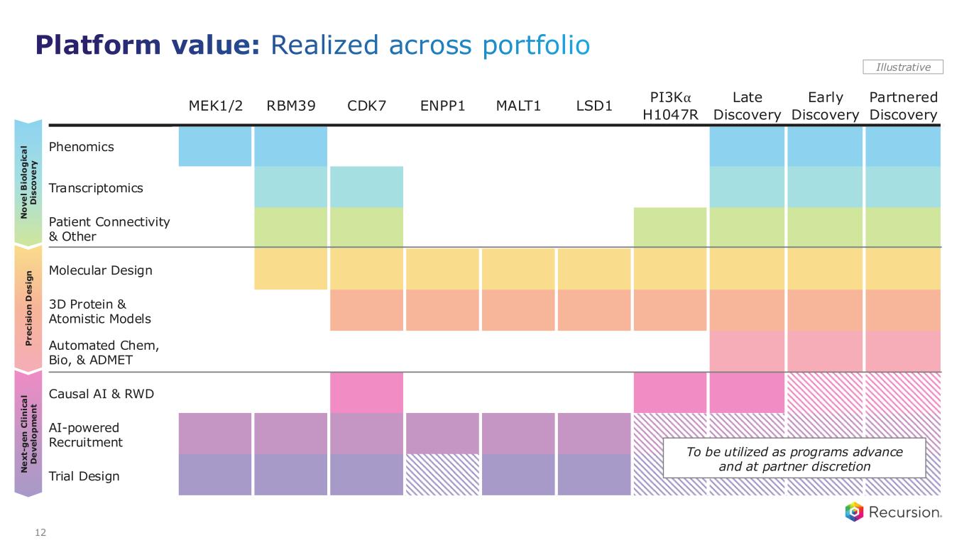 Wholly owned pipeline: Translating insight into proof Differentiation powered by the Recursion OS — from biology to design to clinical development 11 Target Disease Indication Late Discovery Preclinical Phase 1/2 Phase 3 Potential Milestone REC-4881 MEK1/2 Familial adenomatous polyposis (FAP) Initiate FDA engagement – 1H26 REC-617 CDK7 Advanced solid tumors Combination data – 1H27 REC-1245 RBM39 Biomarker-enriched solid tumors & lymphoma Ph 1/2 data – 1H26 REC-3565 MALT1 B-cell malignancies Ph 1 data – 1H27 REC-4539 LSD1 Solid tumors & hematology oncology Ph 1 trial start – 1H26 REC-7735 PI3Kα H1047R Solid tumors (incl. HR+ breast cancer) Go/no-go decision – 2H261 REC-102 ENPP1 Hypophosphatasia (HPP) Go/no-go decision – 2H261 1. Data-driven decision for potential Phase 1 initiation