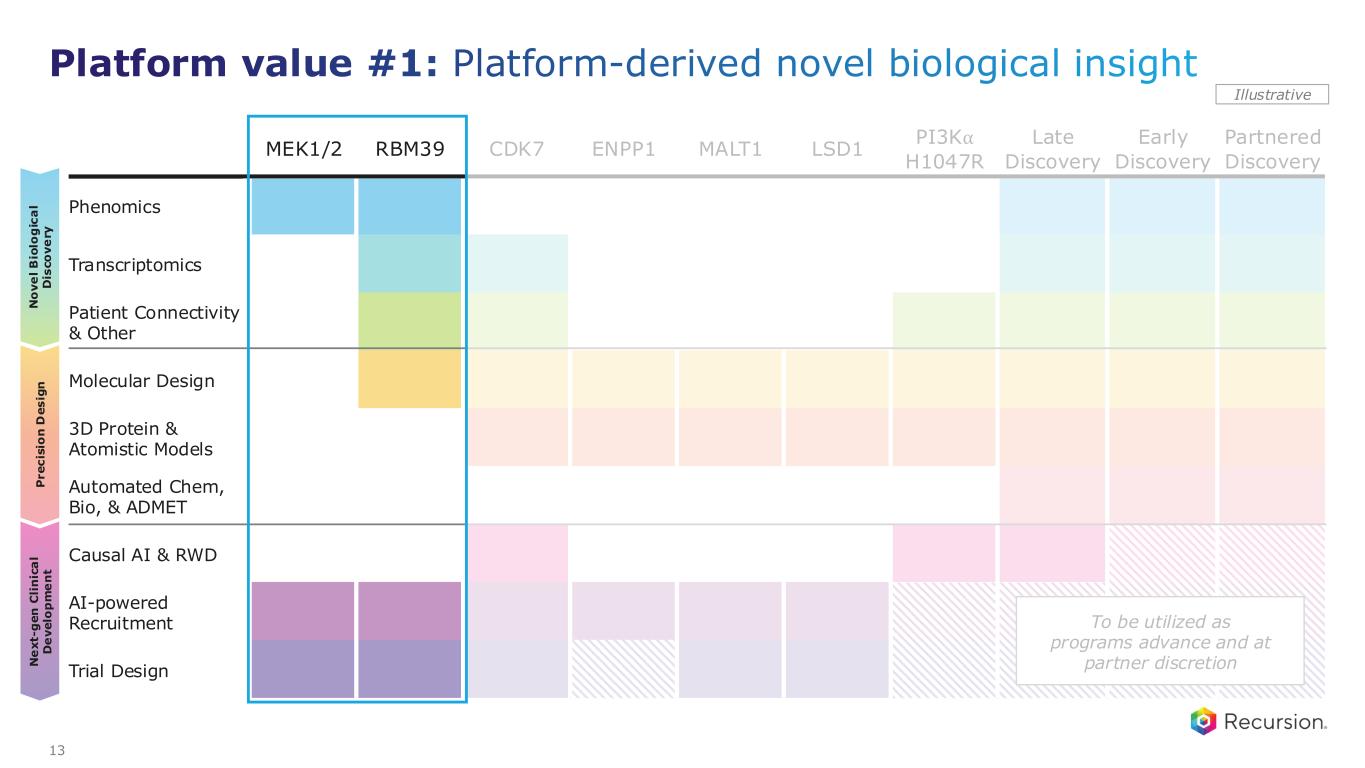 MEK1/2 RBM39 CDK7 ENPP1 MALT1 LSD1 PI3K⍺ H1047R Late Discovery Early Discovery Partnered Discovery Phenomics Transcriptomics Patient Connectivity & Other Molecular Design 3D Protein & Atomistic Models Automated Chem, Bio, & ADMET Causal AI & RWD AI-powered Recruitment Trial Design P r e c is io n D e s ig n N o v e l B io lo g ic a l D is c o v e ry N e x t- g e n C li n ic a l D e v e lo p m e n t Illustrative To be utilized as programs advance and at partner discretion 12 Platform value: Realized across portfolio