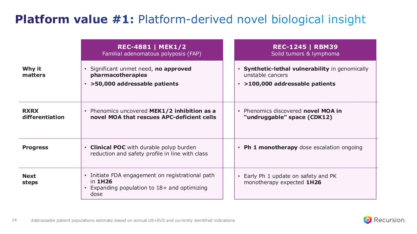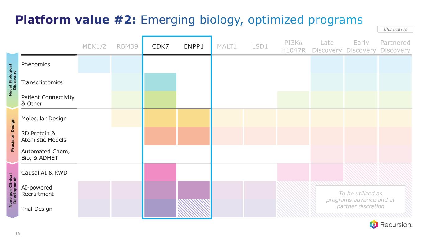 MEK1/2 RBM39 CDK7 ENPP1 MALT1 LSD1 PI3K⍺ H1047R Late Discovery Early Discovery Partnered Discovery Phenomics Transcriptomics Patient Connectivity & Other Molecular Design 3D Protein & Atomistic Models Automated Chem, Bio, & ADMET Causal AI & RWD AI-powered Recruitment Trial Design P r e c is io n D e s ig n N o v e l B io lo g ic a l D is c o v e ry N e x t- g e n C li n ic a l D e v e lo p m e n t Illustrative 13 Platform value #1: Platform-derived novel biological insight To be utilized as programs advance and at partner discretion