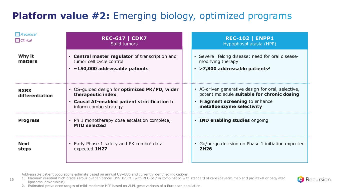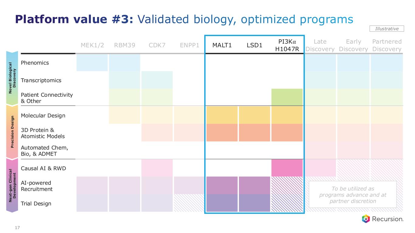 MEK1/2 RBM39 CDK7 ENPP1 MALT1 LSD1 PI3K⍺ H1047R Late Discovery Early Discovery Partnered Discovery Phenomics Transcriptomics Patient Connectivity & Other Molecular Design 3D Protein & Atomistic Models Automated Chem, Bio, & ADMET Causal AI & RWD AI-powered Recruitment Trial Design P r e c is io n D e s ig n N o v e l B io lo g ic a l D is c o v e ry N e x t- g e n C li n ic a l D e v e lo p m e n t Illustrative 15 Platform value #2: Emerging biology, optimized programs To be utilized as programs advance and at partner discretion