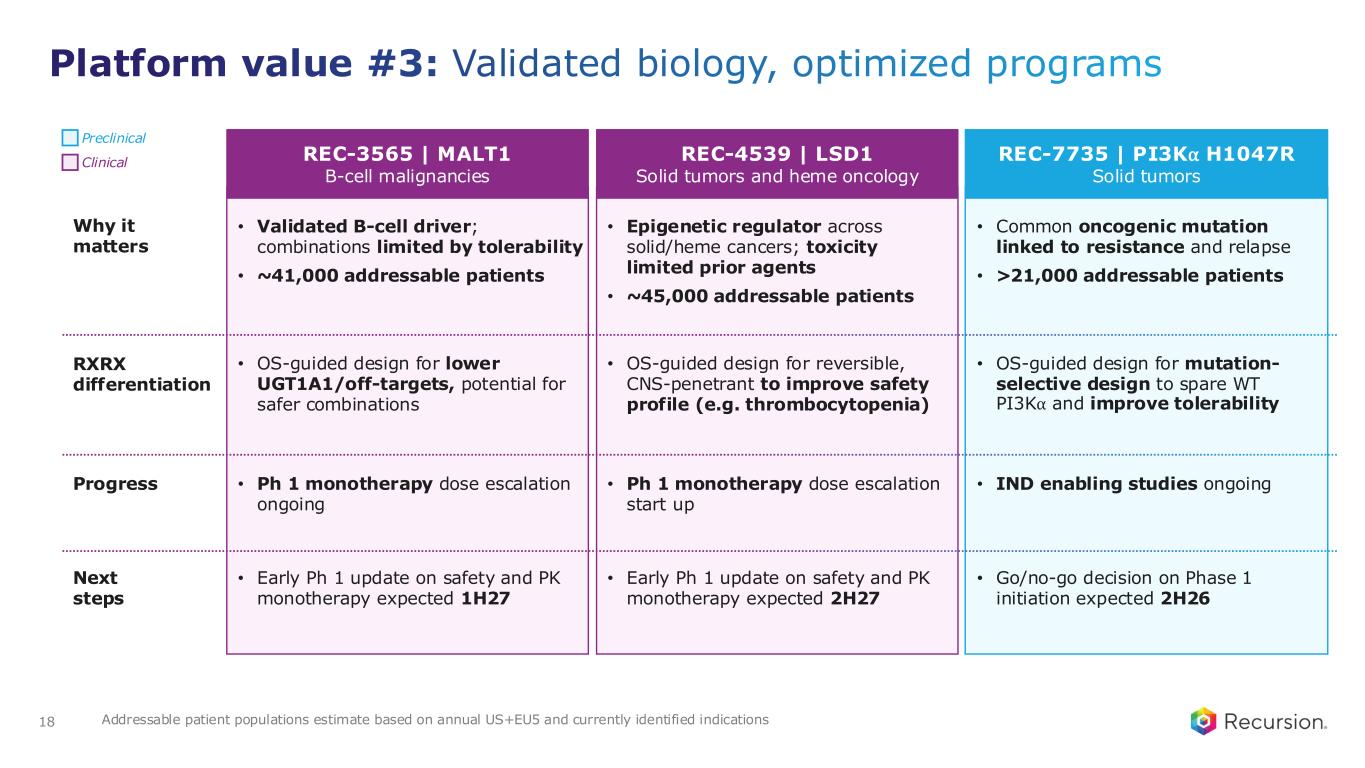 MEK1/2 RBM39 CDK7 ENPP1 MALT1 LSD1 PI3K⍺ H1047R Late Discovery Early Discovery Partnered Discovery Phenomics Transcriptomics Patient Connectivity & Other Molecular Design 3D Protein & Atomistic Models Automated Chem, Bio, & ADMET Causal AI & RWD AI-powered Recruitment Trial Design P r e c is io n D e s ig n N o v e l B io lo g ic a l D is c o v e ry N e x t- g e n C li n ic a l D e v e lo p m e n t Illustrative To be utilized as programs advance and at partner discretion 17 Platform value #3: Validated biology, optimized programs