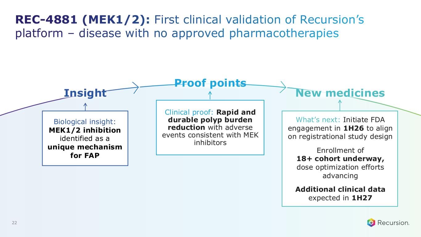 21 Durability: Durable reductions in polyp burden maintained with 4mg dose of REC-4881 Note: Polyp burden defined as the sum of all diameters of polyps in the GI 1. Following the March data cut, a quality review identified suboptimal bowel preparation at baseline. To ensure an accurate, like-for-like assessment, polyp burden was re-evaluated using video review restricted to the clean distal LGI segments matched to the same anatomical regions at Weeks 13 and 25 2. Patient reached W25 but did not perform W25 Assessment 3. Efficacy Evaluable Population (n=12): Defined as all participants who have measurable disease (non-zero polyp burden) at end of baseline endoscopy, received at least 75% of study drug, and have at least one post-baseline on study endoscopic assessment. One patient was efficacy evaluable after completion of W25 assessment but did not complete W13 assessment, baseline measurement carried forward for W13 assessment per SAP for missing data. Therefore, this patient contributed 0% polyp burden reduction at W13 and not shown in figure. Data Cutoff Date: 2025-11-25 • 82% of evaluable patients responded • 73% achieved durable ≥30% reductions • Polyp burden reduction: 53% median REC-4881 4mg dose level % change from baseline in total polyp burden at Week 25 (12 weeks off therapy) % c h a n g e f ro m b a s e li n e Percent (%) change from baseline calculates the change between post-resection value from screening visit to the pre-resection value at Week 25/EOT visit. 1 Off Treatment Phase | Week 25