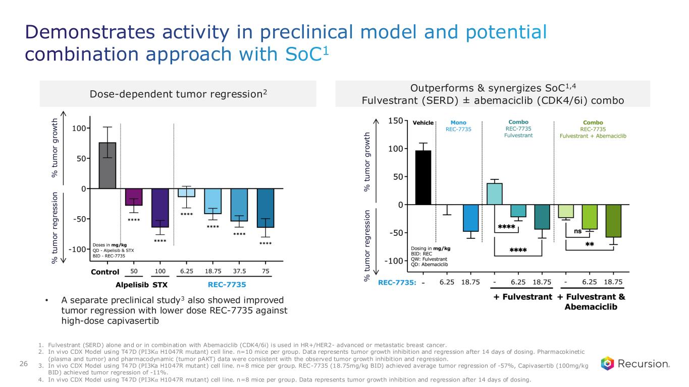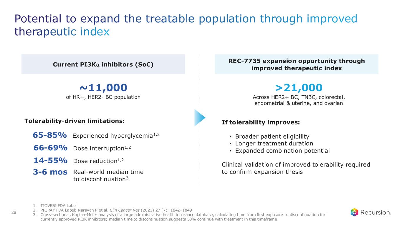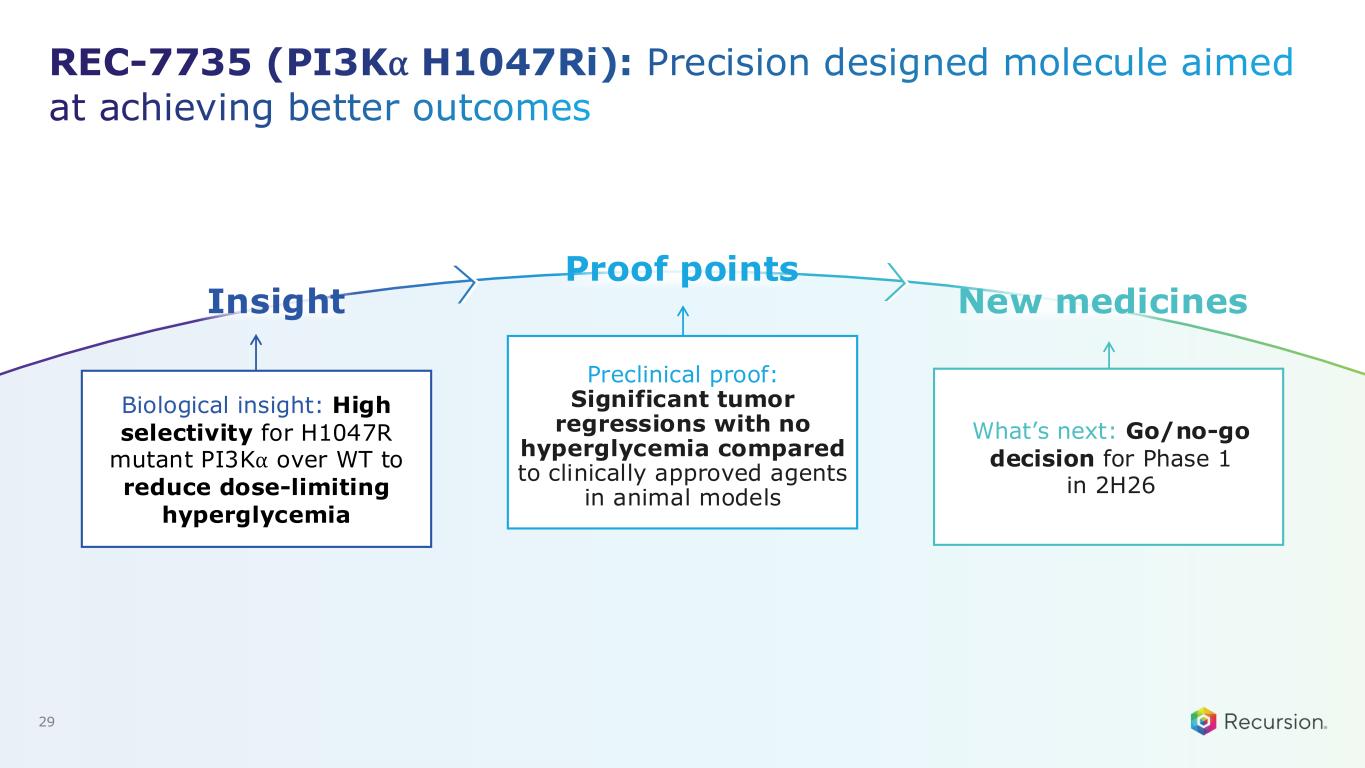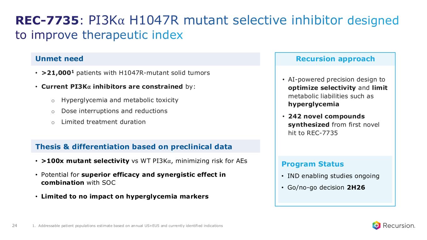 REC-7735: PI3K⍺ H1047R mutant selective inhibitor designed to improve therapeutic index Unmet need • >21,0001 patients with H1047R-mutant solid tumors • Current PI3K⍺ inhibitors are constrained by: o Hyperglycemia and metabolic toxicity o Dose interruptions and reductions o Limited treatment duration Thesis & differentiation based on preclinical data • >100x mutant selectivity vs WT PI3K⍺, minimizing risk for AEs • Potential for superior efficacy and synergistic effect in combination with SOC • Limited to no impact on hyperglycemia markers 1. Addressable patient populations estimate based on annual US+EU5 and currently identified indications24 Recursion approach • AI-powered precision design to optimize selectivity and limit metabolic liabilities such as hyperglycemia • 242 novel compounds synthesized from first novel hit to REC-7735 Program Status • IND enabling studies ongoing • Go/no-go decision 2H26