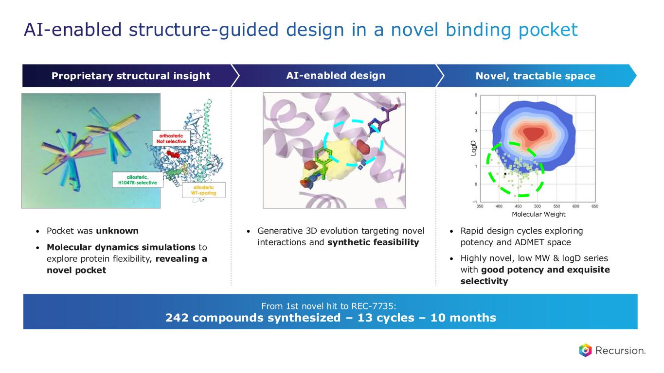 • Generative 3D evolution targeting novel interactions and synthetic feasibility • Pocket was unknown • Molecular dynamics simulations to explore protein flexibility, revealing a novel pocket • Rapid design cycles exploring potency and ADMET space • Highly novel, low MW & logD series with good potency and exquisite selectivity L o g D Molecular Weight AI-enabled structure-guided design in a novel binding pocket Novel, tractable spaceAI-enabled designProprietary structural insight From 1st novel hit to REC-7735: 242 compounds synthesized – 13 cycles – 10 months