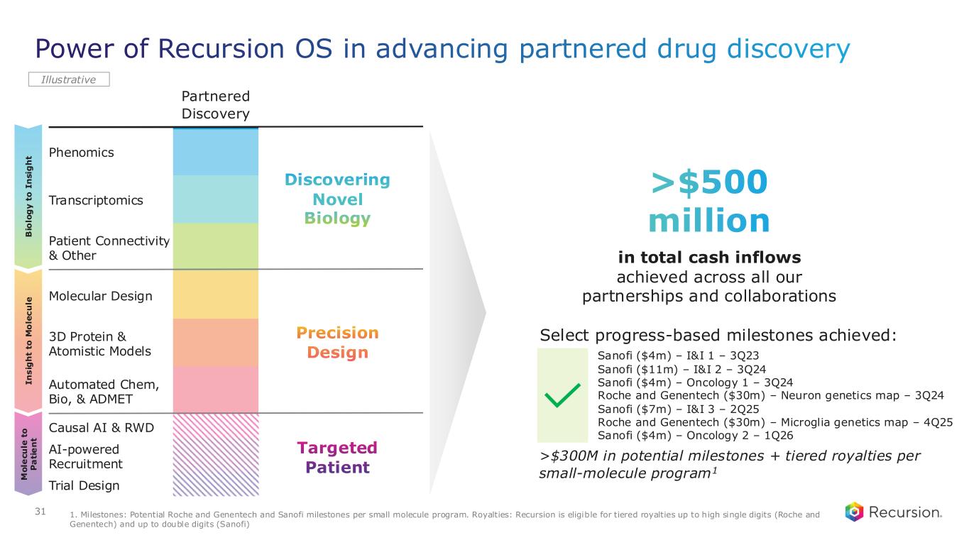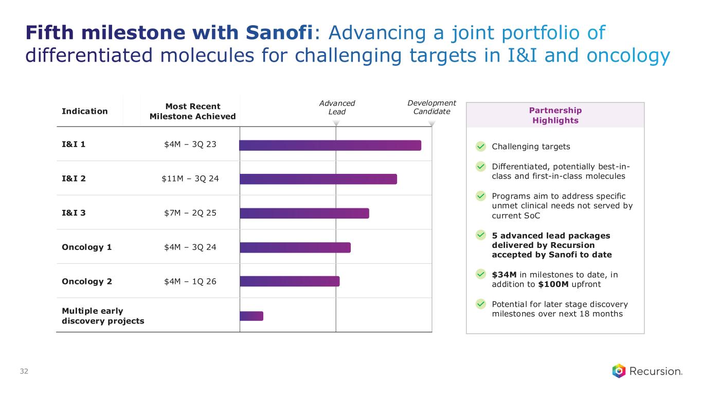 Power of Recursion OS in advancing partnered drug discovery Partnered Discovery Phenomics Transcriptomics Patient Connectivity & Other Molecular Design 3D Protein & Atomistic Models Automated Chem, Bio, & ADMET Causal AI & RWD AI-powered Recruitment Trial Design I n s ig h t to M o le c u le B io lo g y t o I n s ig h t M o le c u le t o P a ti e n t Illustrative Discovering Novel Biology Precision Design Targeted Patient in total cash inflows achieved across all our partnerships and collaborations >$500 million 31 Select progress-based milestones achieved: Roche and Genentech ($30m) – Neuron genetics map – 3Q24 Sanofi ($7m) – I&I 3 – 2Q25 Roche and Genentech ($30m) – Microglia genetics map – 4Q25 Sanofi ($4m) – Oncology 2 – 1Q26 Sanofi ($4m) – I&I 1 – 3Q23 Sanofi ($11m) – I&I 2 – 3Q24 Sanofi ($4m) – Oncology 1 – 3Q24 >$300M in potential milestones + tiered royalties per small-molecule program1 1. Milestones: Potential Roche and Genentech and Sanofi milestones per small molecule program. Royalties: Recursion is eligible for tiered royalties up to high single digits (Roche and Genentech) and up to double digits (Sanofi)