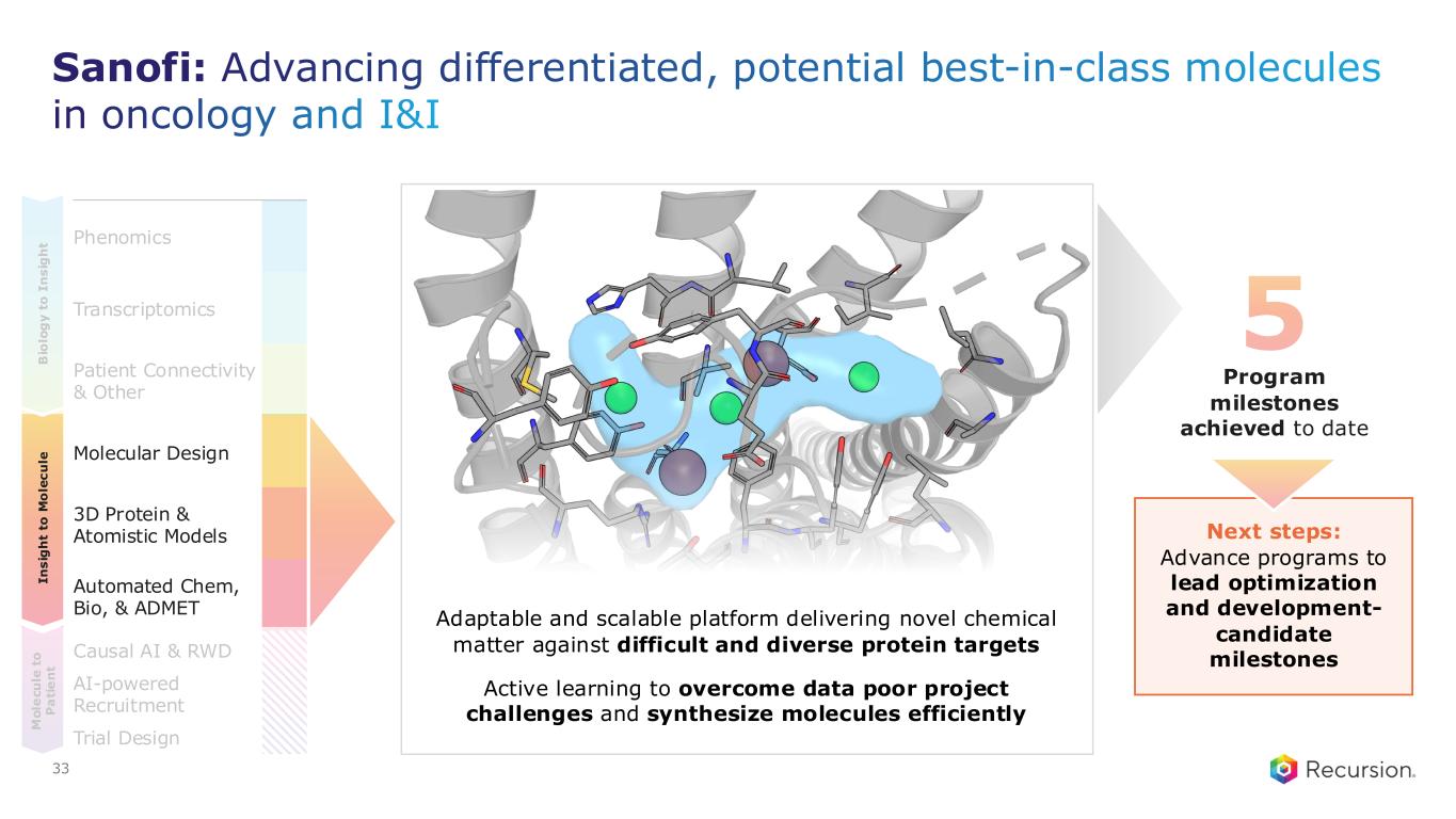 Challenging targets Differentiated, potentially best-in- class and first-in-class molecules Programs aim to address specific unmet clinical needs not served by current SoC 5 advanced lead packages delivered by Recursion accepted by Sanofi to date $34M in milestones to date, in addition to $100M upfront Potential for later stage discovery milestones over next 18 months Fifth milestone with Sanofi: Advancing a joint portfolio of differentiated molecules for challenging targets in I&I and oncology 32 Indication Most Recent Milestone Achieved I&I 1 $4M – 3Q 23 I&I 2 $11M – 3Q 24 I&I 3 $7M – 2Q 25 Oncology 1 $4M – 3Q 24 Oncology 2 $4M – 1Q 26 Multiple early discovery projects Advanced Lead Development Candidate Partnership Highlights
