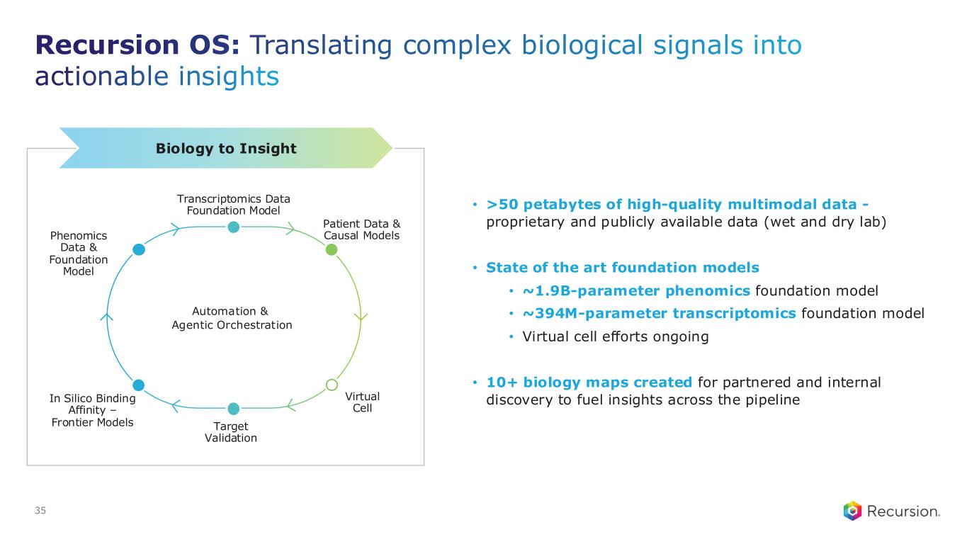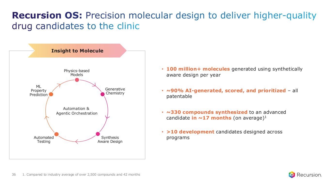 Recursion OS: Translating complex biological signals into actionable insights 35 Biology to Insight • >50 petabytes of high-quality multimodal data - proprietary and publicly available data (wet and dry lab) • State of the art foundation models • ~1.9B-parameter phenomics foundation model • ~394M-parameter transcriptomics foundation model • Virtual cell efforts ongoing • 10+ biology maps created for partnered and internal discovery to fuel insights across the pipelineIn Silico Binding Affinity – Frontier Models Transcriptomics Data Foundation Model Virtual Cell Target Validation Phenomics Data & Foundation Model Automation & Agentic Orchestration Patient Data & Causal Models