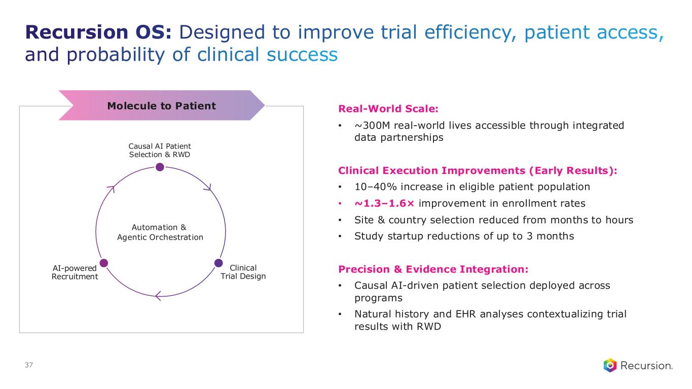 Recursion OS: Precision molecular design to deliver higher-quality drug candidates to the clinic 36 • 100 million+ molecules generated using synthetically aware design per year • ~90% AI-generated, scored, and prioritized – all patentable • ~330 compounds synthesized to an advanced candidate in ~17 months (on average)1 • >10 development candidates designed across programs 1. Compared to industry average of over 2,500 compounds and 42 months Insight to Molecule Automated Testing Synthesis Aware Design Physics-based Models ML Property Prediction Generative Chemistry Automation & Agentic Orchestration