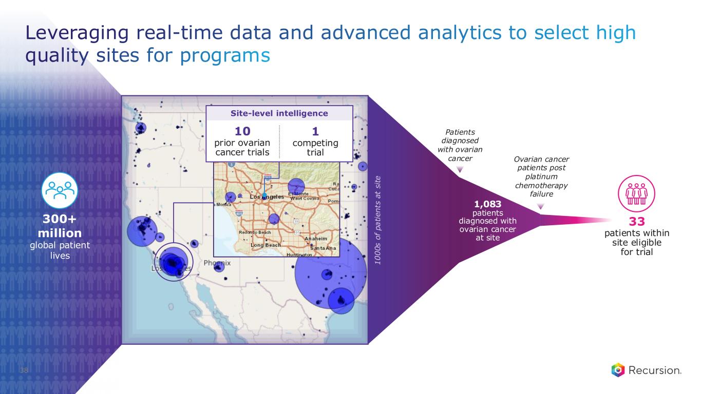 Recursion OS: Designed to improve trial efficiency, patient access, and probability of clinical success 37 Causal AI Patient Selection & RWD Automation & Agentic Orchestration AI-powered Recruitment Clinical Trial Design Molecule to Patient Real-World Scale: • ~300M real-world lives accessible through integrated data partnerships Clinical Execution Improvements (Early Results): • 10–40% increase in eligible patient population • ~1.3–1.6× improvement in enrollment rates • Site & country selection reduced from months to hours • Study startup reductions of up to 3 months Precision & Evidence Integration: • Causal AI-driven patient selection deployed across programs • Natural history and EHR analyses contextualizing trial results with RWD