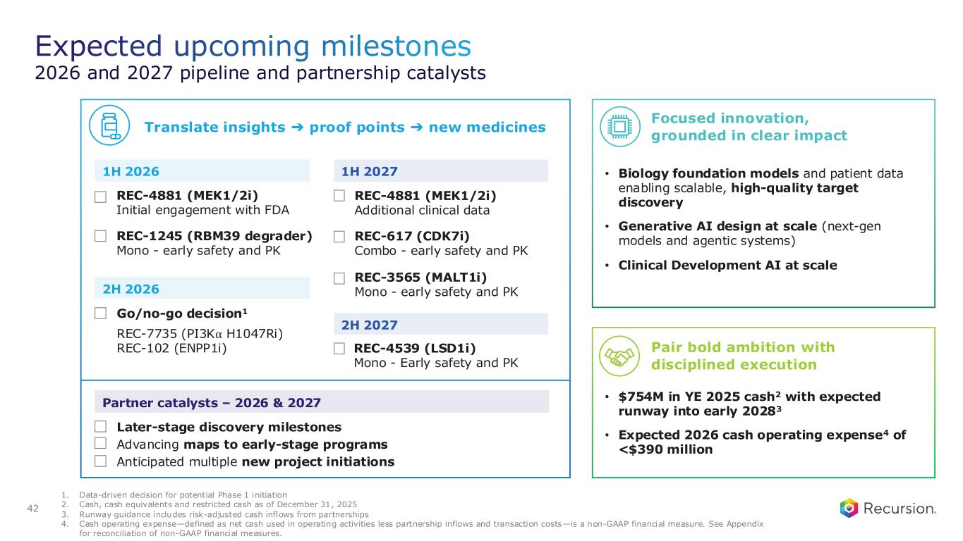 Expected upcoming milestones 2026 and 2027 pipeline and partnership catalysts 42 1. Data-driven decision for potential Phase 1 initiation 2. Cash, cash equivalents and restricted cash as of December 31, 2025 3. Runway guidance includes risk-adjusted cash inflows from partnerships 4. Cash operating expense—defined as net cash used in operating activities less partnership inflows and transaction costs—is a non-GAAP financial measure. See Appendix for reconciliation of non-GAAP financial measures. Translate insights ➔ proof points ➔ new medicines Pair bold ambition with disciplined execution Focused innovation, grounded in clear impact 1H 2026 REC-4881 (MEK1/2i) Initial engagement with FDA REC-1245 (RBM39 degrader) Mono - early safety and PK 2H 2027 REC-4539 (LSD1i) Mono - Early safety and PK 1H 2027 REC-4881 (MEK1/2i) Additional clinical data REC-617 (CDK7i) Combo - early safety and PK REC-3565 (MALT1i) Mono - early safety and PK • $754M in YE 2025 cash2 with expected runway into early 20283 • Expected 2026 cash operating expense4 of <$390 million • Biology foundation models and patient data enabling scalable, high-quality target discovery • Generative AI design at scale (next-gen models and agentic systems) • Clinical Development AI at scale Partner catalysts – 2026 & 2027 Later-stage discovery milestones Advancing maps to early-stage programs Anticipated multiple new project initiations 2H 2026 Go/no-go decision1 REC-7735 (PI3K⍺ H1047Ri) REC-102 (ENPP1i)