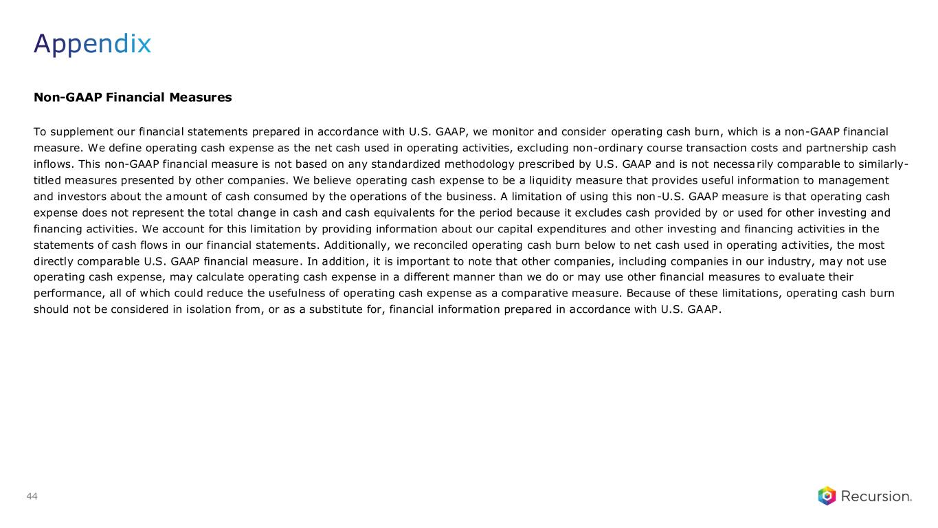 Non-GAAP Financial Measures To supplement our financial statements prepared in accordance with U.S. GAAP, we monitor and consider operating cash burn, which is a non-GAAP financial measure. We define operating cash expense as the net cash used in operating activities, excluding non-ordinary course transaction costs and partnership cash inflows. This non-GAAP financial measure is not based on any standardized methodology prescribed by U.S. GAAP and is not necessarily comparable to similarly- titled measures presented by other companies. We believe operating cash expense to be a liquidity measure that provides useful information to management and investors about the amount of cash consumed by the operations of the business. A limitation of using this non-U.S. GAAP measure is that operating cash expense does not represent the total change in cash and cash equivalents for the period because it excludes cash provided by or used for other investing and financing activities. We account for this limitation by providing information about our capital expenditures and other investing and financing activities in the statements of cash flows in our financial statements. Additionally, we reconciled operating cash burn below to net cash used in operating activities, the most directly comparable U.S. GAAP financial measure. In addition, it is important to note that other companies, including companies in our industry, may not use operating cash expense, may calculate operating cash expense in a different manner than we do or may use other financial measures to evaluate their performance, all of which could reduce the usefulness of operating cash expense as a comparative measure. Because of these limitations, operating cash burn should not be considered in isolation from, or as a substitute for, financial information prepared in accordance with U.S. GAAP. Appendix 44
