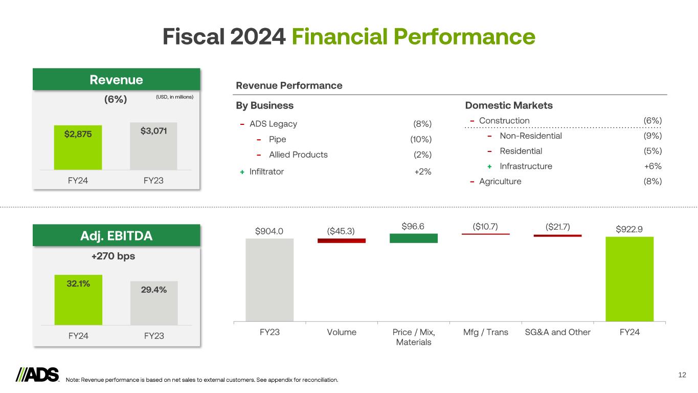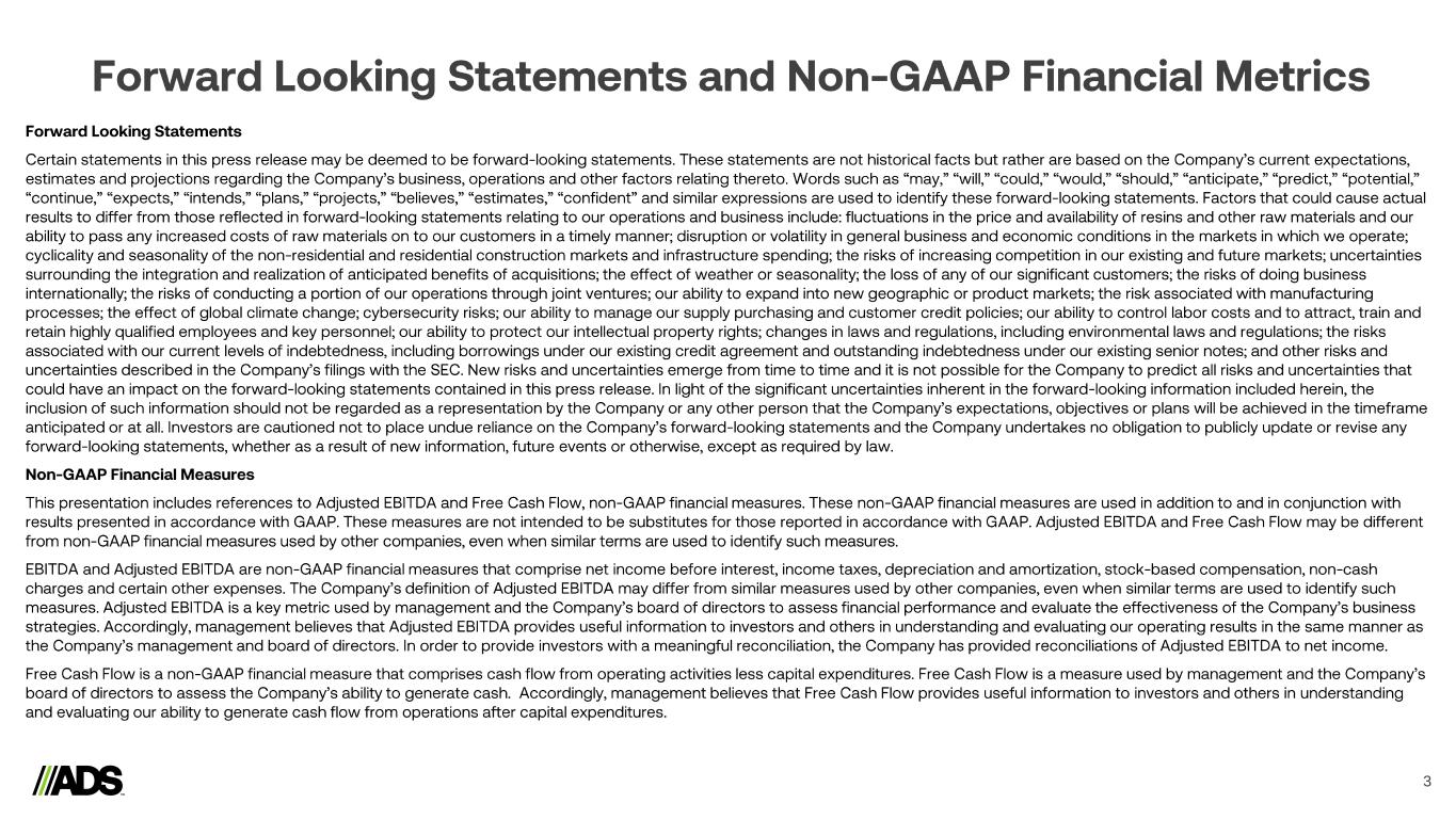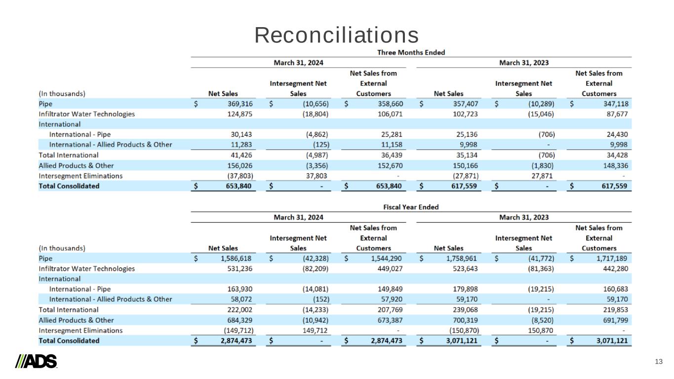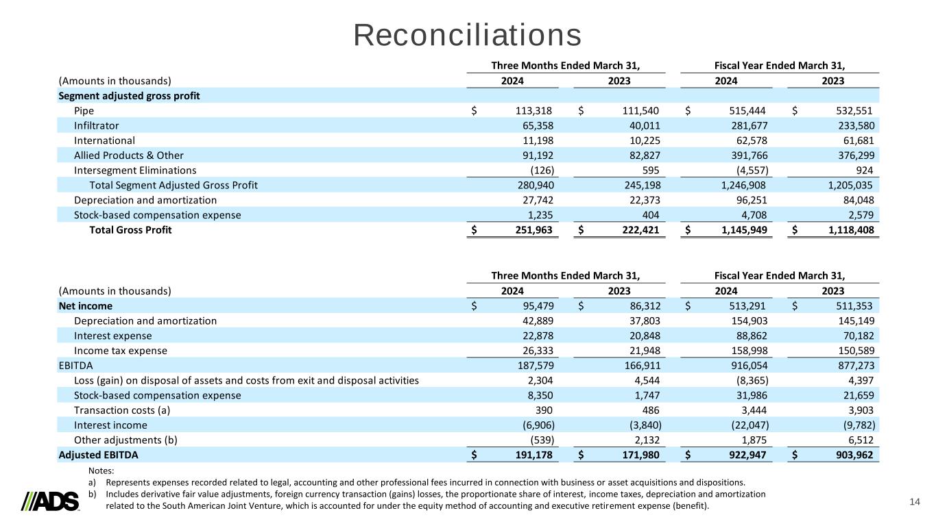 Reconciliations 14 Notes: a) Represents expenses recorded related to legal, accounting and other professional fees incurred in connection with business or asset acquisitions and dispositions. b) Includes derivative fair value adjustments, foreign currency transaction (gains) losses, the proportionate share of interest, income taxes, depreciation and amortization related to the South American Joint Venture, which is accounted for under the equity method of accounting and executive retirement expense (benefit). (Amounts in thousands) 2024 2023 2024 2023 Segment adjusted gross profit Pipe $ 113,318 $ 111,540 $ 515,444 $ 532,551 Infiltrator 65,358 40,011 281,677 233,580 International 11,198 10,225 62,578 61,681 Allied Products & Other 91,192 82,827 391,766 376,299 Intersegment Eliminations (126) 595 (4,557) 924 Total Segment Adjusted Gross Profit 280,940 245,198 1,246,908 1,205,035 Depreciation and amortization 27,742 22,373 96,251 84,048 Stock-based compensation expense 1,235 404 4,708 2,579 Total Gross Profit $ 251,963 $ 222,421 $ 1,145,949 $ 1,118,408 (Amounts in thousands) 2024 2023 2024 2023 Net income $ 95,479 $ 86,312 $ 513,291 $ 511,353 Depreciation and amortization 42,889 37,803 154,903 145,149 Interest expense 22,878 20,848 88,862 70,182 Income tax expense 26,333 21,948 158,998 150,589 EBITDA 187,579 166,911 916,054 877,273 Loss (gain) on disposal of assets and costs from exit and disposal activities 2,304 4,544 (8,365) 4,397 Stock-based compensation expense 8,350 1,747 31,986 21,659 Transaction costs (a) 390 486 3,444 3,903 Interest income (6,906) (3,840) (22,047) (9,782) Other adjustments (b) (539) 2,132 1,875 6,512 Adjusted EBITDA $ 191,178 $ 171,980 $ 922,947 $ 903,962 Three Months Ended March 31, Fiscal Year Ended March 31, Three Months Ended March 31, Fiscal Year Ended March 31,