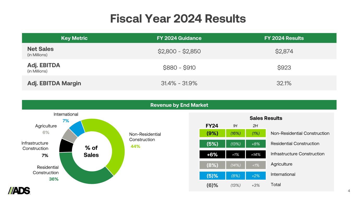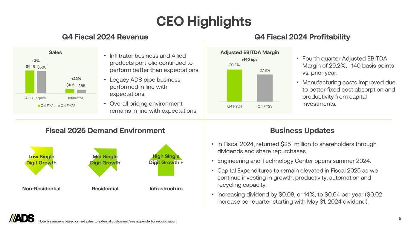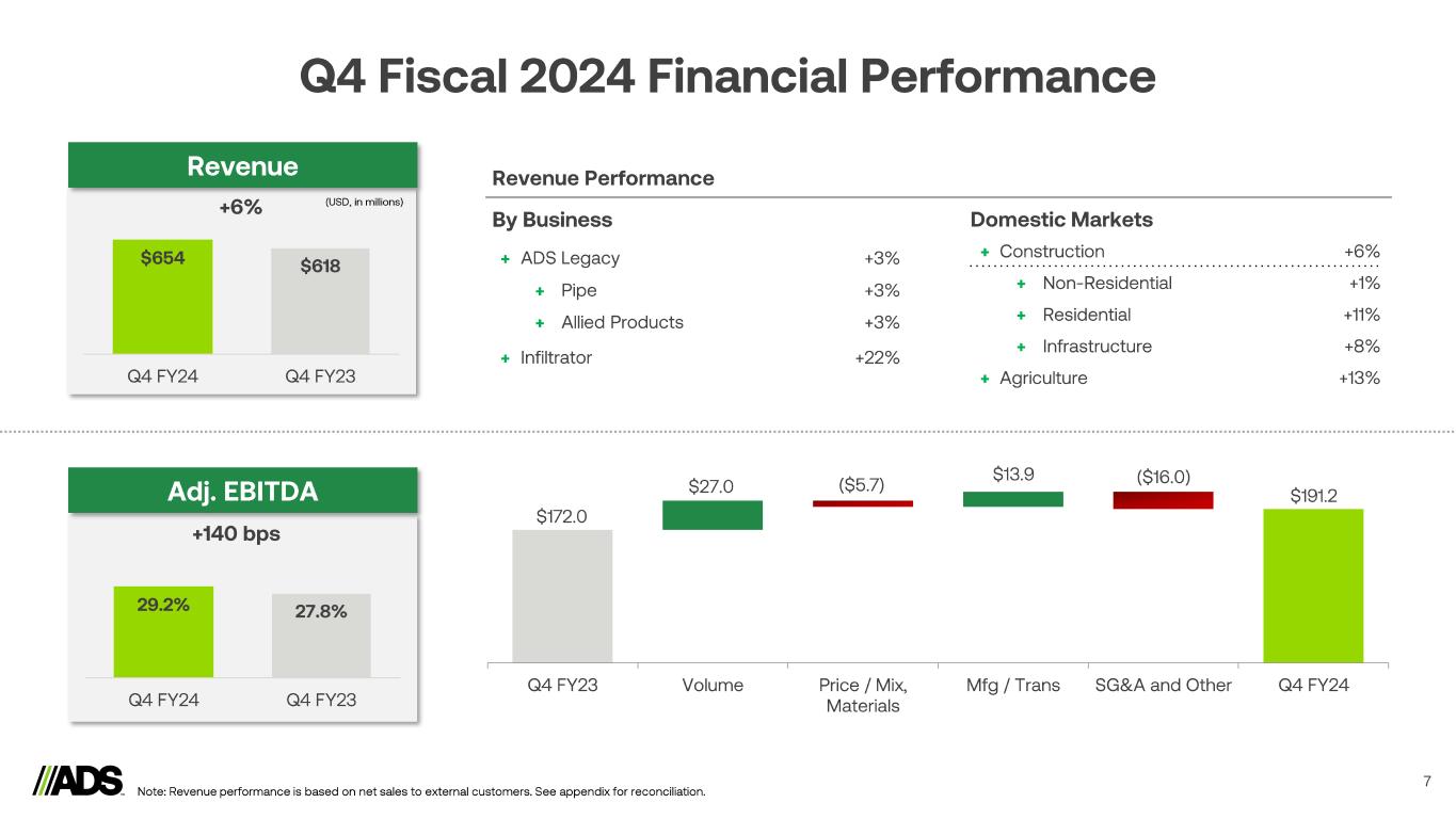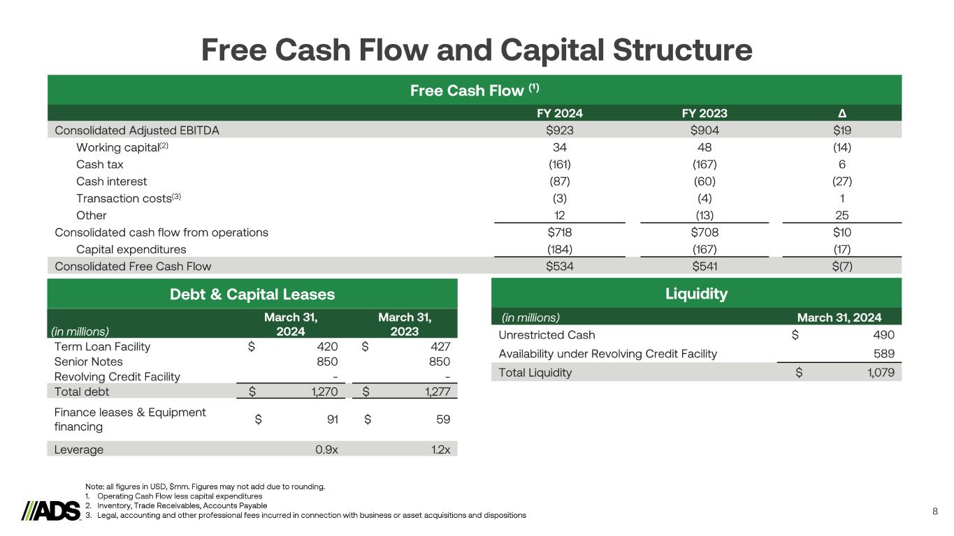 Reconciliations 14 Notes: a) Represents expenses recorded related to legal, accounting and other professional fees incurred in connection with business or asset acquisitions and dispositions. b) Includes derivative fair value adjustments, foreign currency transaction (gains) losses, the proportionate share of interest, income taxes, depreciation and amortization related to the South American Joint Venture, which is accounted for under the equity method of accounting and executive retirement expense (benefit). (Amounts in thousands) 2024 2023 2024 2023 Segment adjusted gross profit Pipe $ 113,318 $ 111,540 $ 515,444 $ 532,551 Infiltrator 65,358 40,011 281,677 233,580 International 11,198 10,225 62,578 61,681 Allied Products & Other 91,192 82,827 391,766 376,299 Intersegment Eliminations (126) 595 (4,557) 924 Total Segment Adjusted Gross Profit 280,940 245,198 1,246,908 1,205,035 Depreciation and amortization 27,742 22,373 96,251 84,048 Stock-based compensation expense 1,235 404 4,708 2,579 Total Gross Profit $ 251,963 $ 222,421 $ 1,145,949 $ 1,118,408 (Amounts in thousands) 2024 2023 2024 2023 Net income $ 95,479 $ 86,312 $ 513,291 $ 511,353 Depreciation and amortization 42,889 37,803 154,903 145,149 Interest expense 22,878 20,848 88,862 70,182 Income tax expense 26,333 21,948 158,998 150,589 EBITDA 187,579 166,911 916,054 877,273 Loss (gain) on disposal of assets and costs from exit and disposal activities 2,304 4,544 (8,365) 4,397 Stock-based compensation expense 8,350 1,747 31,986 21,659 Transaction costs (a) 390 486 3,444 3,903 Interest income (6,906) (3,840) (22,047) (9,782) Other adjustments (b) (539) 2,132 1,875 6,512 Adjusted EBITDA $ 191,178 $ 171,980 $ 922,947 $ 903,962 Three Months Ended March 31, Fiscal Year Ended March 31, Three Months Ended March 31, Fiscal Year Ended March 31,