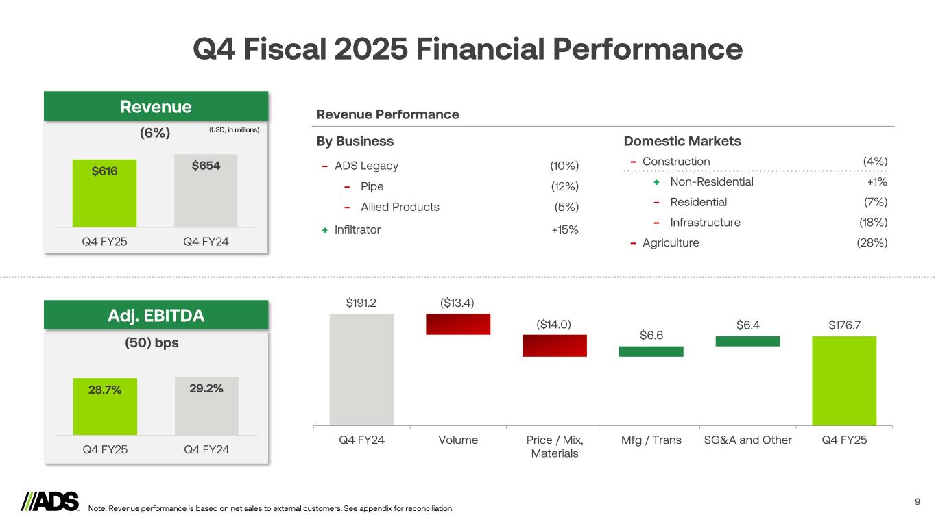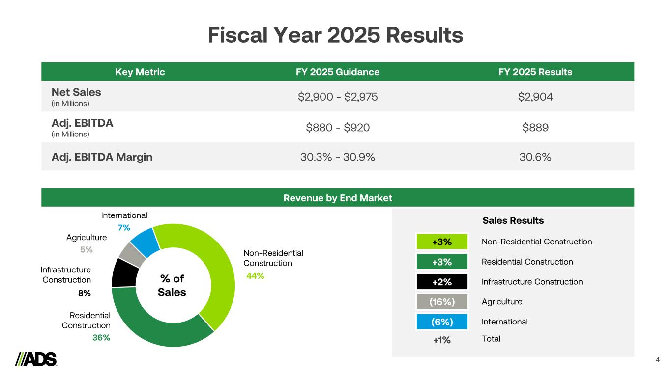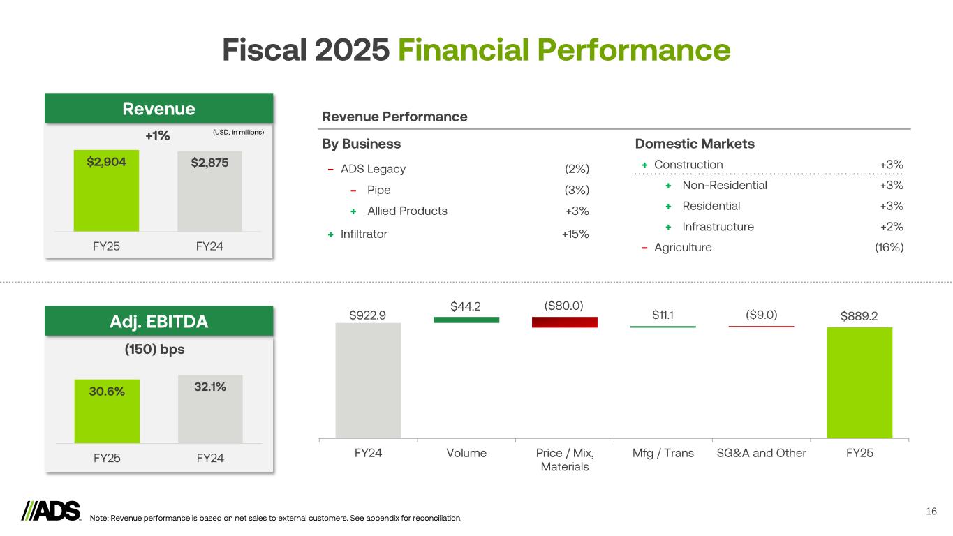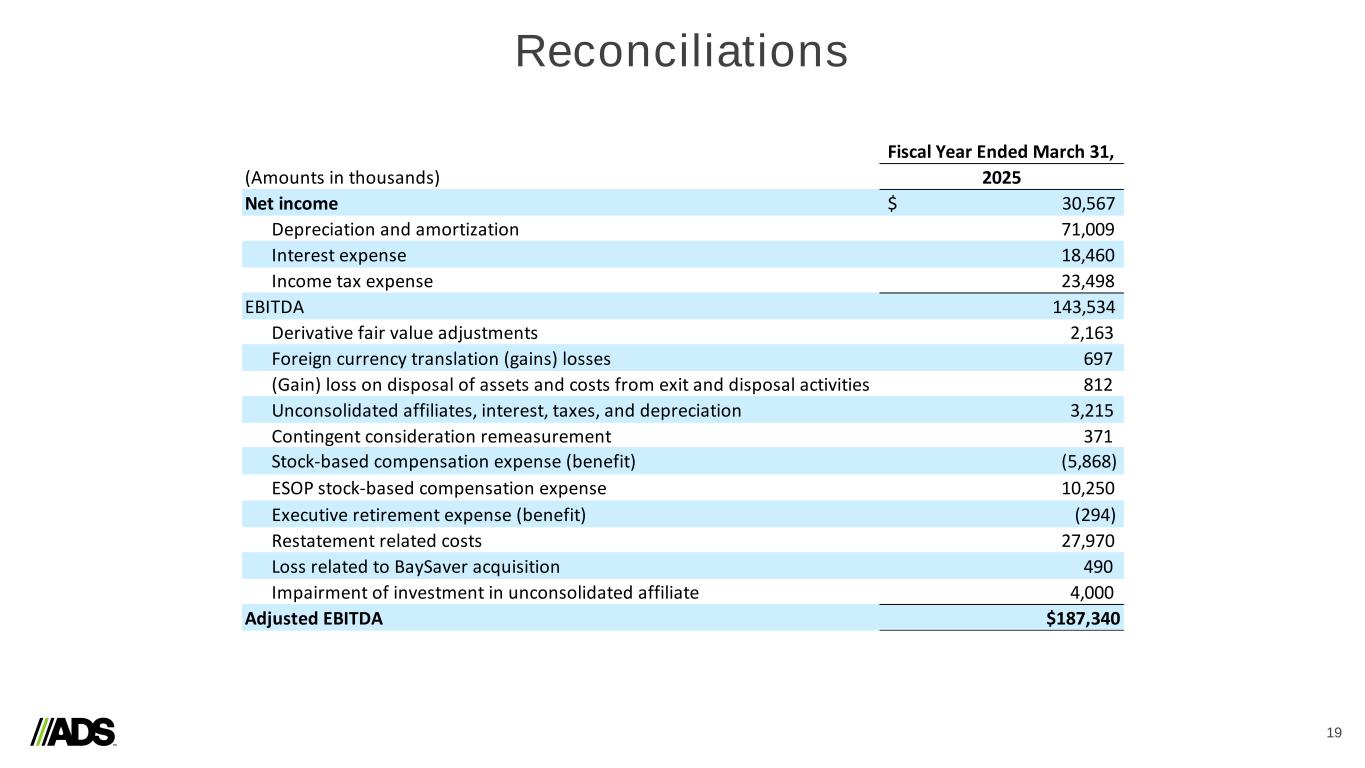 Reconciliations 18 Notes: a) Represents expenses recorded related to legal, accounting and other professional fees incurred in connection with business or asset acquisitions and dispositions. b) Includes derivative fair value adjustments, foreign currency transaction (gains) losses, the proportionate share of interest, income taxes, depreciation and amortization related to the South American Joint Venture, which is accounted for under the equity method of accounting and executive retirement expense (benefit). (Amounts in thousands) 2025 2024 2025 2024 Segment adjusted gross profit Pipe $ 99,985 $ 113,318 $ 448,544 $ 515,444 Infiltrator 68,807 65,358 319,642 281,677 International 7,385 11,198 56,564 62,578 Allied Products & Other 83,498 91,192 397,627 391,766 Intersegment Eliminations (6) (126) 174 (4,557) Total Segment Adjusted Gross Profit 259,669 280,940 1,222,551 1,246,908 Depreciation and amortization 32,316 27,742 120,818 96,251 Stock-based compensation expense 1,101 1,235 5,232 4,708 Inventory step-up relate to Orenco acquisition - - 2,260 - Total Gross Profit $ 226,252 $ 251,963 $ 1,094,241 $ 1,145,949 (Amounts in thousands) 2025 2024 2025 2024 Net income $ 76,788 $ 95,479 $ 452,573 $ 513,291 Depreciation and amortization 49,610 42,889 183,281 154,903 Interest expense 22,729 22,878 91,803 88,862 Income tax expense 23,166 26,333 141,063 158,998 EBITDA 172,293 187,579 868,720 916,054 Loss (gain) on disposal of assets and costs from exit and disposal activities 3,426 2,304 3,858 (8,365) Stock-based compensation expense 4,823 8,350 26,581 31,986 Transaction costs (a) 672 390 9,291 3,444 Interest income (5,007) (6,906) (23,485) (22,047) Other adjustments (b) 488 (539) 4,263 1,875 Adjusted EBITDA $ 176,695 $ 191,178 $ 889,228 $ 922,947 Three Months Ended March 31, Twelve Months Ended March 31, Three Months Ended March 31, Twelve Months Ended March 31,