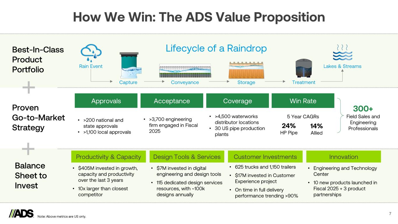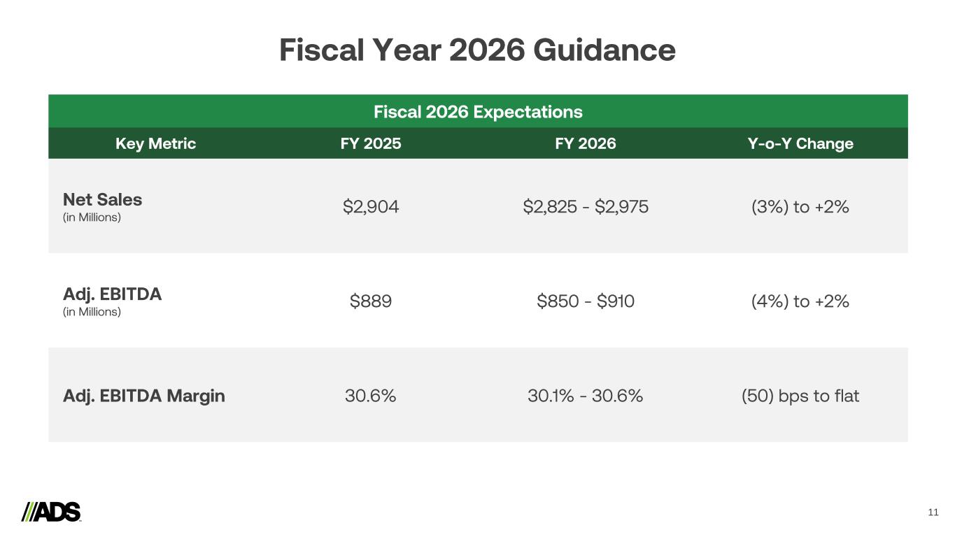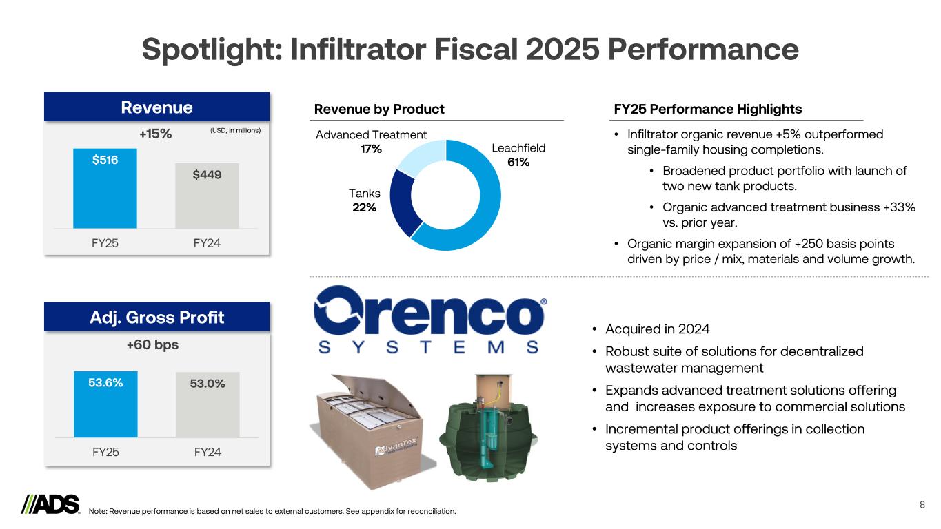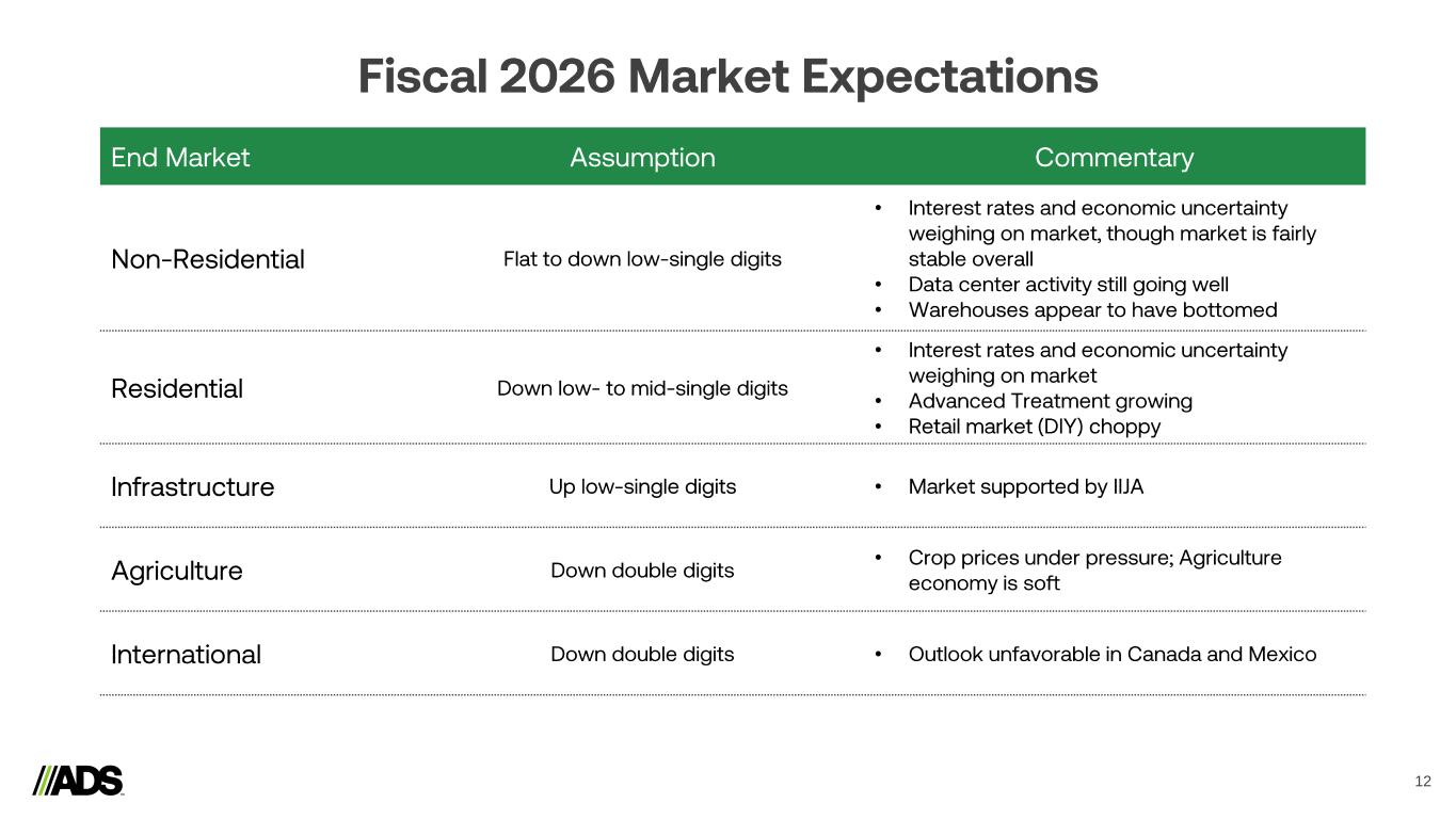 Reconciliations 18 Notes: a) Represents expenses recorded related to legal, accounting and other professional fees incurred in connection with business or asset acquisitions and dispositions. b) Includes derivative fair value adjustments, foreign currency transaction (gains) losses, the proportionate share of interest, income taxes, depreciation and amortization related to the South American Joint Venture, which is accounted for under the equity method of accounting and executive retirement expense (benefit). (Amounts in thousands) 2025 2024 2025 2024 Segment adjusted gross profit Pipe $ 99,985 $ 113,318 $ 448,544 $ 515,444 Infiltrator 68,807 65,358 319,642 281,677 International 7,385 11,198 56,564 62,578 Allied Products & Other 83,498 91,192 397,627 391,766 Intersegment Eliminations (6) (126) 174 (4,557) Total Segment Adjusted Gross Profit 259,669 280,940 1,222,551 1,246,908 Depreciation and amortization 32,316 27,742 120,818 96,251 Stock-based compensation expense 1,101 1,235 5,232 4,708 Inventory step-up relate to Orenco acquisition - - 2,260 - Total Gross Profit $ 226,252 $ 251,963 $ 1,094,241 $ 1,145,949 (Amounts in thousands) 2025 2024 2025 2024 Net income $ 76,788 $ 95,479 $ 452,573 $ 513,291 Depreciation and amortization 49,610 42,889 183,281 154,903 Interest expense 22,729 22,878 91,803 88,862 Income tax expense 23,166 26,333 141,063 158,998 EBITDA 172,293 187,579 868,720 916,054 Loss (gain) on disposal of assets and costs from exit and disposal activities 3,426 2,304 3,858 (8,365) Stock-based compensation expense 4,823 8,350 26,581 31,986 Transaction costs (a) 672 390 9,291 3,444 Interest income (5,007) (6,906) (23,485) (22,047) Other adjustments (b) 488 (539) 4,263 1,875 Adjusted EBITDA $ 176,695 $ 191,178 $ 889,228 $ 922,947 Three Months Ended March 31, Twelve Months Ended March 31, Three Months Ended March 31, Twelve Months Ended March 31,