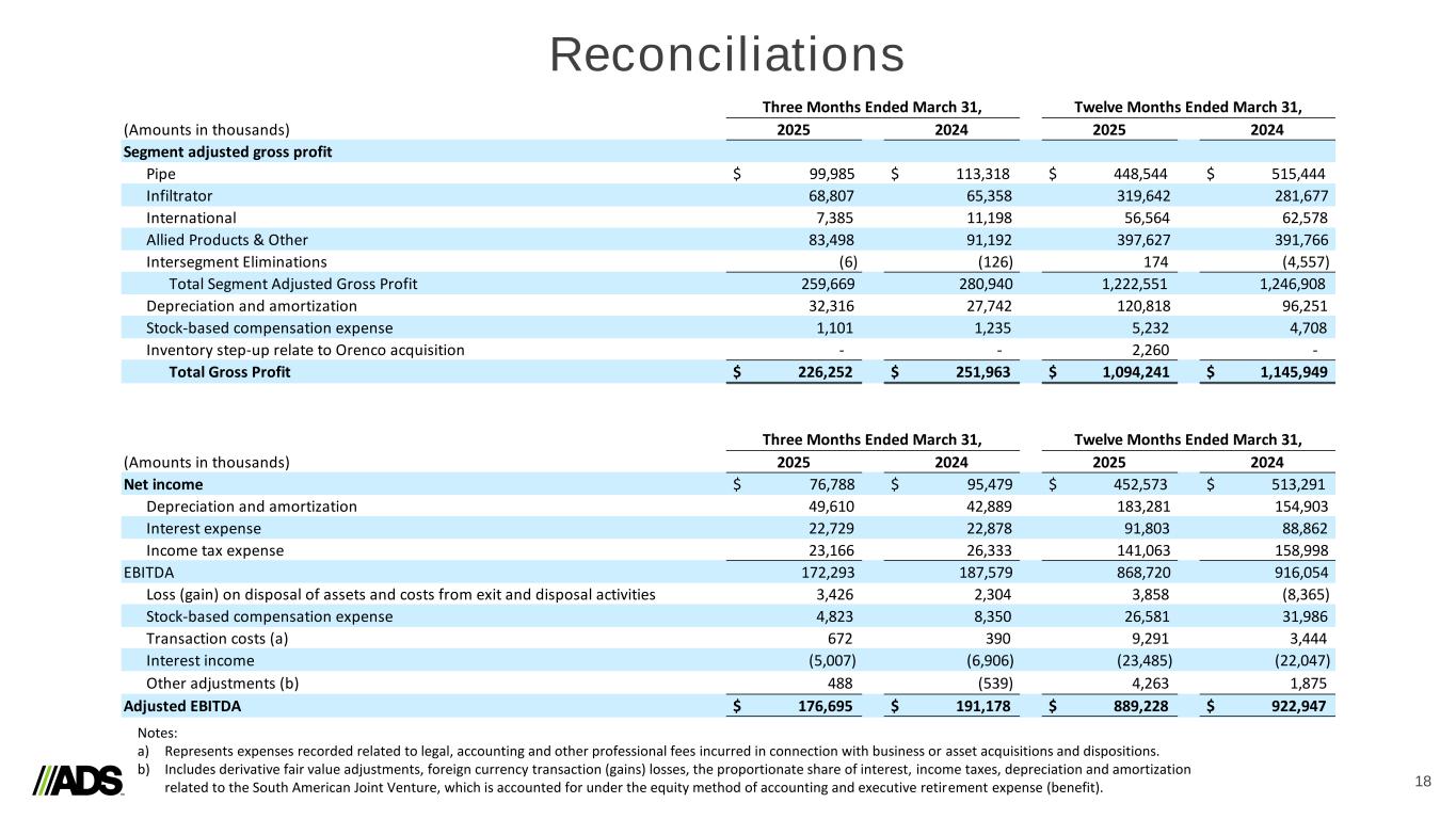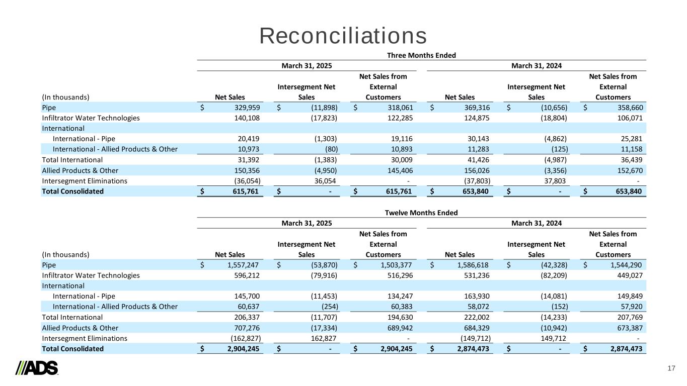 Reconciliations 17 (In thousands) Net Sales Intersegment Net Sales Net Sales from External Customers Net Sales Intersegment Net Sales Net Sales from External Customers Pipe $ 329,959 $ (11,898) $ 318,061 $ 369,316 $ (10,656) $ 358,660 Infiltrator Water Technologies 140,108 (17,823) 122,285 124,875 (18,804) 106,071 International International - Pipe 20,419 (1,303) 19,116 30,143 (4,862) 25,281 International - Allied Products & Other 10,973 (80) 10,893 11,283 (125) 11,158 Total International 31,392 (1,383) 30,009 41,426 (4,987) 36,439 Allied Products & Other 150,356 (4,950) 145,406 156,026 (3,356) 152,670 Intersegment Eliminations (36,054) 36,054 - (37,803) 37,803 - Total Consolidated $ 615,761 $ - $ 615,761 $ 653,840 $ - $ 653,840 (In thousands) Net Sales Intersegment Net Sales Net Sales from External Customers Net Sales Intersegment Net Sales Net Sales from External Customers Pipe $ 1,557,247 $ (53,870) $ 1,503,377 $ 1,586,618 $ (42,328) $ 1,544,290 Infiltrator Water Technologies 596,212 (79,916) 516,296 531,236 (82,209) 449,027 International International - Pipe 145,700 (11,453) 134,247 163,930 (14,081) 149,849 International - Allied Products & Other 60,637 (254) 60,383 58,072 (152) 57,920 Total International 206,337 (11,707) 194,630 222,002 (14,233) 207,769 Allied Products & Other 707,276 (17,334) 689,942 684,329 (10,942) 673,387 Intersegment Eliminations (162,827) 162,827 - (149,712) 149,712 - Total Consolidated $ 2,904,245 $ - $ 2,904,245 $ 2,874,473 $ - $ 2,874,473 Three Months Ended March 31, 2025 March 31, 2024 Twelve Months Ended March 31, 2025 March 31, 2024