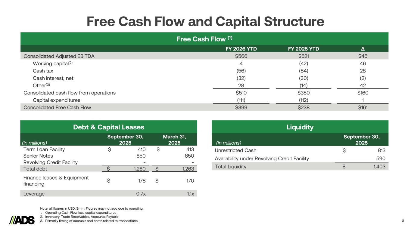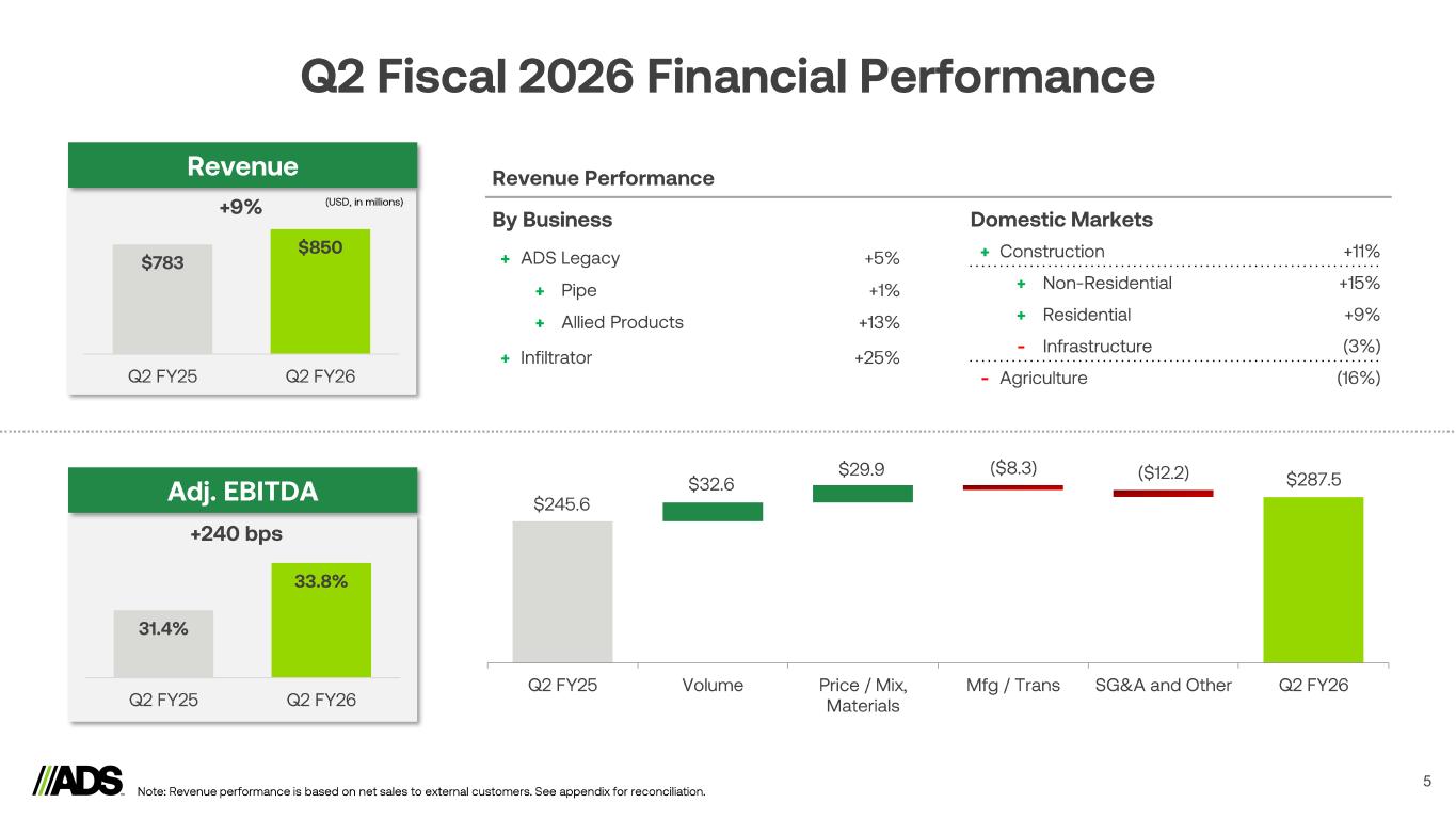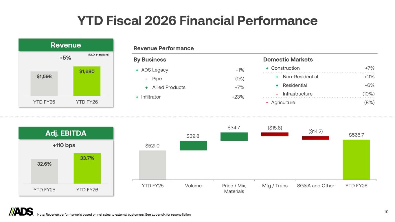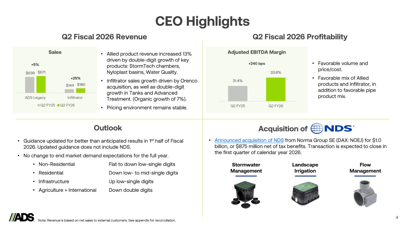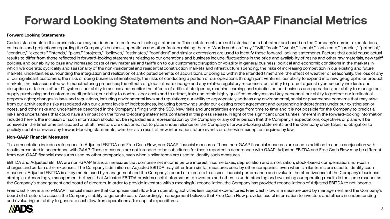 Reconciliations 12 Notes: a) Includes costs associated with closure of one recycling facility, one offsite storage location and one distribution yard, as well as professional fees incurred in connection with supporting enterprise-wide restructuring and realignment initiatives. Excludes gain on sale of properties previously held-for-sale and equipment. b) Includes derivative fair value adjustments, foreign currency transaction (gains) losses, legal settlements, and the proportionate share of interest, income taxes, depreciation and amortization related to the South American Joint Venture, which is accounted for under the equity method of accounting and executive retirement expense. (Amounts in thousands) 2025 2024 2025 2024 Segment adjusted gross profit Pipe $ 135,305 $ 113,605 $ 269,410 $ 253,572 Infiltrator 106,117 91,997 210,450 184,901 International 17,371 17,445 31,479 37,108 Allied Products & Other 121,161 103,525 234,977 212,968 Intersegment Eliminations 111 (640) (645) (1,610) Total Segment Adjusted Gross Profit 380,065 325,932 745,671 686,939 Depreciation and amortization 38,019 30,536 71,531 57,748 Stock-based compensation expense 1,914 1,455 3,570 2,796 Total Gross Profit $ 340,132 $ 293,941 $ 670,570 $ 626,395 (Amounts in thousands) 2025 2024 2025 2024 Net income $ 156,500 $ 131,174 $ 300,591 $ 293,496 Depreciation and amortization 54,693 44,807 104,921 85,905 Interest expense 23,116 23,156 46,145 45,980 Income tax expense 52,399 40,920 99,073 90,806 EBITDA 286,708 240,057 550,730 516,187 Restructuring and realignment expense(a) 7,171 - 15,966 - (Gain) loss on disposal of assets (17,644) 617 (16,446) 909 Stock-based compensation expense 8,577 6,983 16,981 13,960 Transaction costs 9,317 2,685 10,124 2,695 Interest income (7,340) (7,368) (12,745) (13,933) Other adjustments(b) 743 2,576 1,089 1,230 Adjusted EBITDA $ 287,532 $ 245,550 $ 565,699 $ 521,048 Three Months Ended September 30, Six Months Ended September 30, Three Months Ended September 30, Six Months Ended September 30,