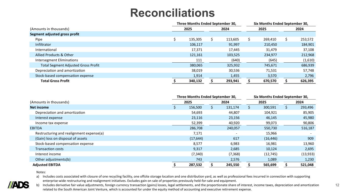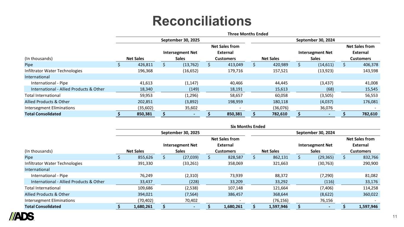 Reconciliations 11 (In thousands) Net Sales Intersegment Net Sales Net Sales from External Customers Net Sales Intersegment Net Sales Net Sales from External Customers Pipe $ 426,811 $ (13,762) $ 413,049 $ 420,989 $ (14,611) $ 406,378 Infiltrator Water Technologies 196,368 (16,652) 179,716 157,521 (13,923) 143,598 International International - Pipe 41,613 (1,147) 40,466 44,445 (3,437) 41,008 International - Allied Products & Other 18,340 (149) 18,191 15,613 (68) 15,545 Total International 59,953 (1,296) 58,657 60,058 (3,505) 56,553 Allied Products & Other 202,851 (3,892) 198,959 180,118 (4,037) 176,081 Intersegment Eliminations (35,602) 35,602 - (36,076) 36,076 - Total Consolidated $ 850,381 $ - $ 850,381 $ 782,610 $ - $ 782,610 (In thousands) Net Sales Intersegment Net Sales Net Sales from External Customers Net Sales Intersegment Net Sales Net Sales from External Customers Pipe $ 855,626 $ (27,039) $ 828,587 $ 862,131 $ (29,365) $ 832,766 Infiltrator Water Technologies 391,330 (33,261) 358,069 321,663 (30,763) 290,900 International International - Pipe 76,249 (2,310) 73,939 88,372 (7,290) 81,082 International - Allied Products & Other 33,437 (228) 33,209 33,292 (116) 33,176 Total International 109,686 (2,538) 107,148 121,664 (7,406) 114,258 Allied Products & Other 394,021 (7,564) 386,457 368,644 (8,622) 360,022 Intersegment Eliminations (70,402) 70,402 - (76,156) 76,156 - Total Consolidated $ 1,680,261 $ - $ 1,680,261 $ 1,597,946 $ - $ 1,597,946 Three Months Ended September 30, 2025 September 30, 2024 Six Months Ended September 30, 2025 September 30, 2024