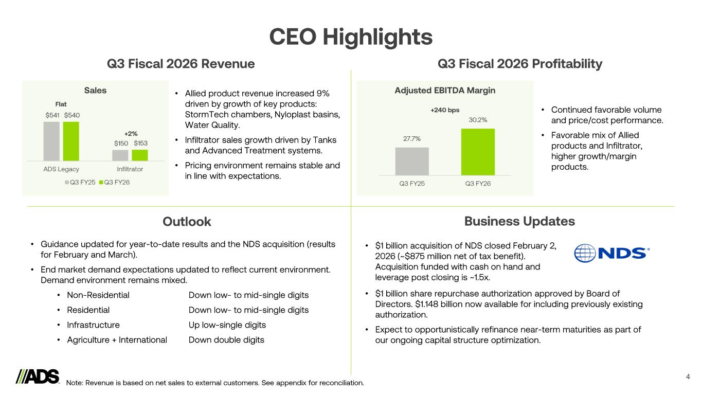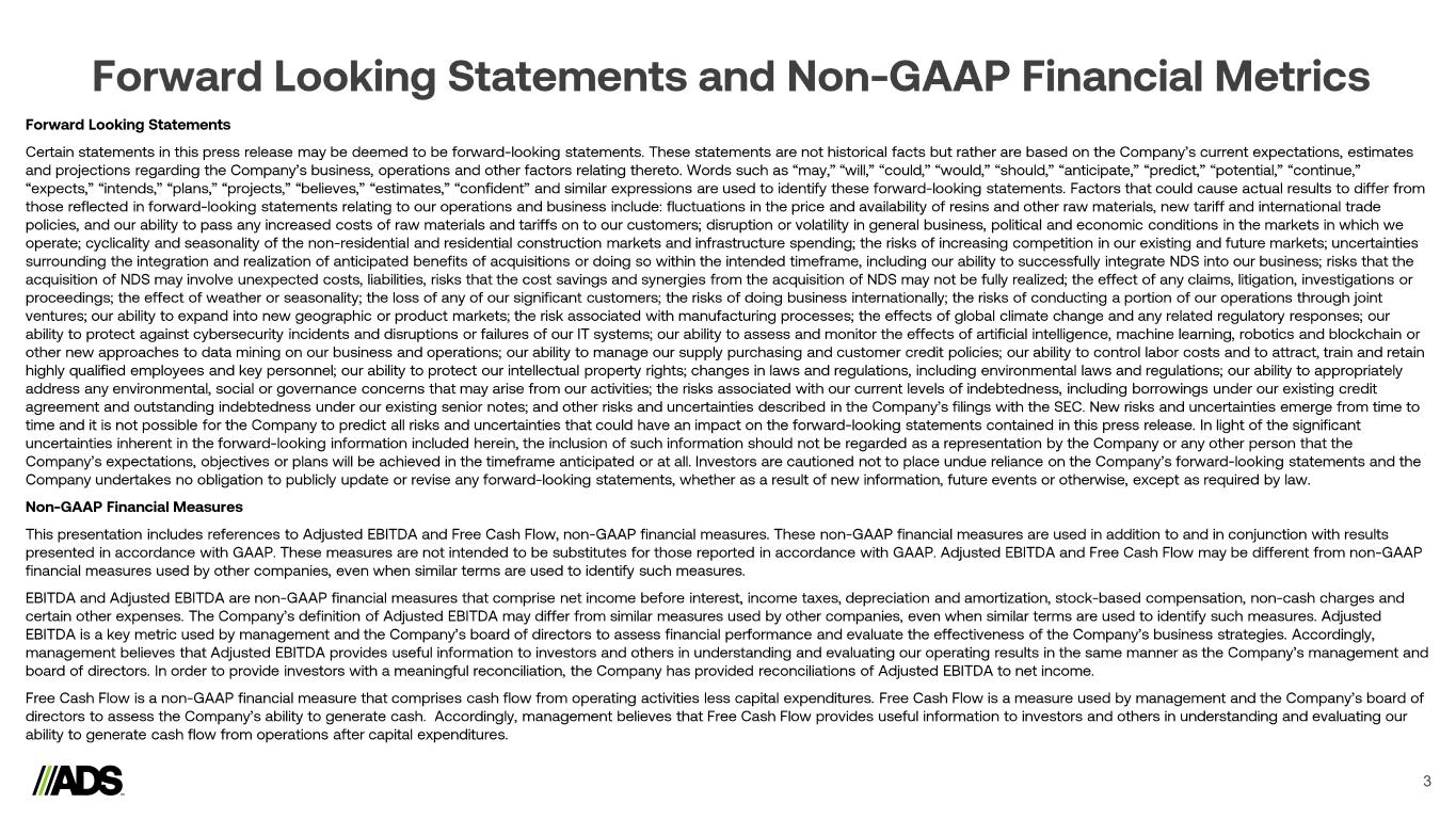 Forward Looking Statements and Non - GAAP Financial Metrics 3 Forward Looking Statements Certain statements in this press release may be deemed to be forward - looking statements. These statements are not historical fac ts but rather are based on the Company’s current expectations, estimates and projections regarding the Company’s business, operations and other factors relating thereto. Words such as “may,” “will,” “could,” “would,” “should,” “anticipate,” “predict,” “potential,” “continue,” “expects,” “intends,” “plans,” “projects,” “believes,” “estimates,” “confident” and similar expressions are used to identify these forward - looking statements. Factors that could cause actual results to differ from those reflected in forward - looking statements relating to our operations and business include: fluctuations in the price and ava ilability of resins and other raw materials, new tariff and international trade policies, and our ability to pass any increased costs of raw materials and tariffs on to our customers; disruption or volatil ity in general business, political and economic conditions in the markets in which we operate; cyclicality and seasonality of the non - residential and residential construction markets and infrastructure spending; th e risks of increasing competition in our existing and future markets; uncertainties surrounding the integration and realization of anticipated benefits of acquisitions or doing so within the intended timeframe , including our ability to successfully integrate NDS into our business; risks that the acquisition of NDS may involve unexpected costs, liabilities, risks that the cost savings and synergies from the acquisition of NDS may not be fully realized; the effect of any claims, litigation, investigations or proceedings; the effect of weather or seasonality; the loss of any of our significant customers; the risks of doing business internationally; the risks of conducting a portion of our operations through joint ventures; our ability to expand into new geographic or product markets; the risk associated with manufacturing processes; the effects of global climate change and any related regulatory responses; our ability to protect against cybersecurity incidents and disruptions or failures of our IT systems; our ability to assess and m onitor the effects of artificial intelligence, machine learning, robotics and blockchain or other new approaches to data mining on our business and operations; our ability to manage our supply purchasing and customer cre dit policies; our ability to control labor costs and to attract, train and retain highly qualified employees and key personnel; our ability to protect our intellectual property rights; changes in laws and re gulations, including environmental laws and regulations; our ability to appropriately address any environmental, social or governance concerns that may arise from our activities; the risks associated with our cu rrent levels of indebtedness, including borrowings under our existing credit agreement and outstanding indebtedness under our existing senior notes; and other risks and uncertainties described in the Co mpa ny’s filings with the SEC. New risks and uncertainties emerge from time to time and it is not possible for the Company to predict all risks and uncertainties that could have an impact on the forward - look ing statements contained in this press release. In light of the significant uncertainties inherent in the forward - looking information included herein, the inclusion of such information should not be regar ded as a representation by the Company or any other person that the Company’s expectations, objectives or plans will be achieved in the timeframe anticipated or at all. Investors are cautioned not to place undue reliance on the Company’s forward - looking statements and the Company undertakes no obligation to publicly update or revise any forward - looking statements, whether as a result of new informa tion, future events or otherwise, except as required by law. Non - GAAP Financial Measures This presentation includes references to Adjusted EBITDA and Free Cash Flow, non - GAAP financial measures. These non - GAAP financi al measures are used in addition to and in conjunction with results presented in accordance with GAAP. These measures are not intended to be substitutes for those reported in accordance with GA AP. Adjusted EBITDA and Free Cash Flow may be different from non - GAAP financial measures used by other companies, even when similar terms are used to identify such measures. EBITDA and Adjusted EBITDA are non - GAAP financial measures that comprise net income before interest, income taxes, depreciation and amortization, stock - based compensation, non - cash charges and certain other expenses. The Company’s definition of Adjusted EBITDA may differ from similar measures used by other companies, even when similar terms are used to identify such measures. Adjusted EBITDA is a key metric used by management and the Company’s board of directors to assess financial performance and evaluate t he effectiveness of the Company’s business strategies. Accordingly, management believes that Adjusted EBITDA provides useful information to investors and others in understanding and evaluating our operating results in the same manner as the Company’s management and board of directors. In order to provide investors with a meaningful reconciliation, the Company has provided reconciliations of Adjusted EBITDA to net income. Free Cash Flow is a non - GAAP financial measure that comprises cash flow from operating activities less capital expenditures. Fre e Cash Flow is a measure used by management and the Company’s board of directors to assess the Company’s ability to generate cash. Accordingly, management believes that Free Cash Flow provides us efu l information to investors and others in understanding and eva