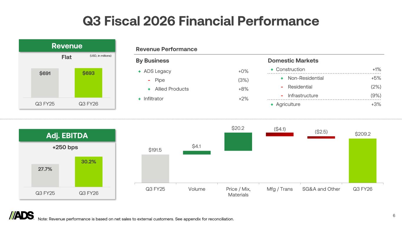 CEO Highlights 4 $541 $150 $540 $153 ADS Legacy Infiltrator Q3 FY25 Q3 FY26 Sales Flat +2% • Allied product revenue increased 9% driven by growth of key products: StormTech chambers, Nyloplast basins, Water Quality. • Infiltrator sales growth driven by Tanks and Advanced Treatment systems. • Pricing environment remains stable and in line with expectations. Q3 Fiscal 2026 Revenue Outlook Q3 Fiscal 2026 Profitability 27.7% 30.2% Q3 FY25 Q3 FY26 Adjusted EBITDA Margin +240 bps • Continued favorable volume and price/cost performance. • Favorable mix of Allied products and Infiltrator, higher growth/margin products. • Guidance updated for year - to- date results and the NDS acquisition (results for February and March). • End market demand expectations updated to reflect current environment. Demand environment remains mixed. • Non - Residential Down low - to mid - single digits • Residential Down low - to mid - single digits • Infrastructure Up low - single digits • Agriculture + International Down double digits Note: Revenue is based on net sales to external customers. See appendix for reconciliation. Business Updates • $1 billion acquisition of NDS closed February 2, 2026 (~$875 million net of tax benefit). Acquisition funded with cash on hand and leverage post closing is ~1.5x. • $1 billion share repurchase authorization approved by Board of Directors. $1.148 billion now available for including previously existing authorization. • Expect to opportunistically refinance near - term maturities as part of our ongoing capital structure optimization.