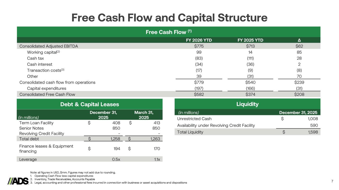 Q3 FY25 Volume Price / Mix, Materials Mfg / Trans SG&A and Other Q3 FY26 Q3 Fiscal 2026 Financial Performance 6 27.7% 30.2% Q3 FY25 Q3 FY26 $691 $693 Q3 FY25 Q3 FY26 +250 bps (USD, in millions)Flat Domestic Markets + Construction +1% + Non - Residential +5% - Residential (2%) - Infrastructure (9%) + Agriculture +3% Revenue Performance By Business + ADS Legacy +0% - Pipe (3%) + Allied Products +8% + Infiltrator +2% $191.5 $4.1 $20.2 ($2.5) $209.2 Revenue Adj. EBITDA ($4.1) Note: Revenue performance is based on net sales to external customers. See appendix for reconciliation.