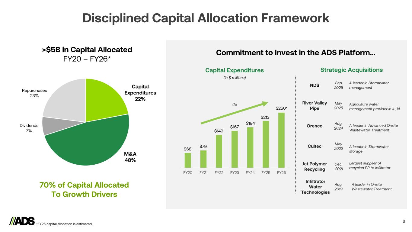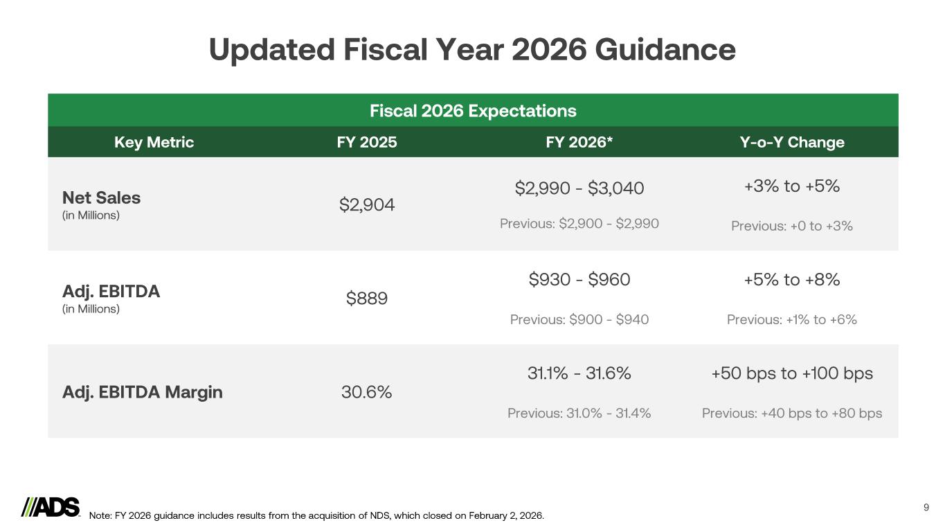8 Disciplined Capital Allocation Framework 70% of Capital Allocated To Growth Drivers M&A 48% Capital Expenditures 22% Dividends 7% Repurchases 23% >$5B in Capital Allocated FY20 – FY26* Commitment to Invest in the ADS Platform… Capital Expenditures Strategic Acquisitions Infiltrator Water Technologies Aug. 2019 A leader in Onsite Wastewater Treatment Cultec May 2022 A leader in Stormwater storage Jet Polymer Recycling Dec. 2021 Largest supplier of recycled PP to Infiltrator Orenco Aug. 2024 A leader in Advanced Onsite Wastewater Treatment FY20 FY21 FY22 FY23 FY24 FY25 FY26 $68 $79 $149 $167 $184 $213 May 2025 Agriculture water management provider in IL, IA River Valley Pipe NDS Sep 2025 A leader in Stormwater management *FY26 capital allocation is estimated. 4x (in $ millions) $250*