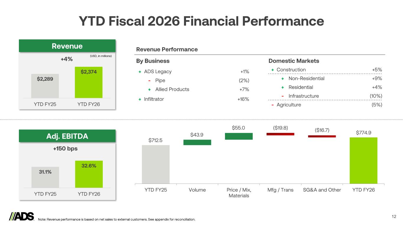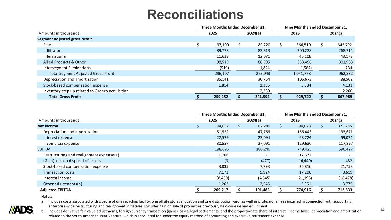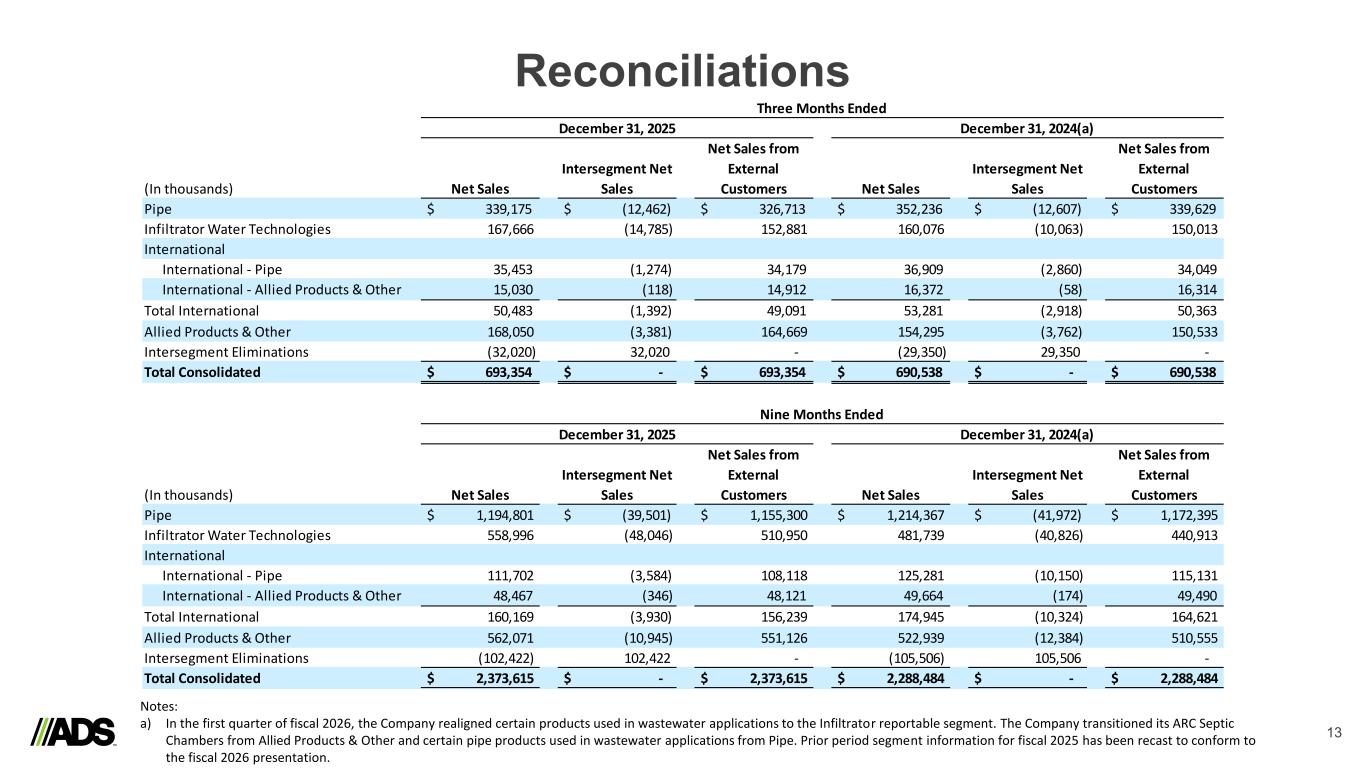 Reconciliations 13 (In thousands) Net Sales Intersegment Net Sales Net Sales from External Customers Net Sales Intersegment Net Sales Net Sales from External Customers Pipe $ 339,175 $ (12,462) $ 326,713 $ 352,236 $ (12,607) $ 339,629 Infiltrator Water Technologies 167,666 (14,785) 152,881 160,076 (10,063) 150,013 International International - Pipe 35,453 (1,274) 34,179 36,909 (2,860) 34,049 International - Allied Products & Other 15,030 (118) 14,912 16,372 (58) 16,314 Total International 50,483 (1,392) 49,091 53,281 (2,918) 50,363 Allied Products & Other 168,050 (3,381) 164,669 154,295 (3,762) 150,533 Intersegment Eliminations (32,020) 32,020 - (29,350) 29,350 - Total Consolidated $ 693,354 $ - $ 693,354 $ 690,538 $ - $ 690,538 (In thousands) Net Sales Intersegment Net Sales Net Sales from External Customers Net Sales Intersegment Net Sales Net Sales from External Customers Pipe $ 1,194,801 $ (39,501) $ 1,155,300 $ 1,214,367 $ (41,972) $ 1,172,395 Infiltrator Water Technologies 558,996 (48,046) 510,950 481,739 (40,826) 440,913 International International - Pipe 111,702 (3,584) 108,118 125,281 (10,150) 115,131 International - Allied Products & Other 48,467 (346) 48,121 49,664 (174) 49,490 Total International 160,169 (3,930) 156,239 174,945 (10,324) 164,621 Allied Products & Other 562,071 (10,945) 551,126 522,939 (12,384) 510,555 Intersegment Eliminations (102,422) 102,422 - (105,506) 105,506 - Total Consolidated $ 2,373,615 $ - $ 2,373,615 $ 2,288,484 $ - $ 2,288,484 Three Months Ended December 31, 2025 December 31, 2024(a) Nine Months Ended December 31, 2025 December 31, 2024(a) Notes: a) In the first quarter of fiscal 2026, the Company realigned certain products used in wastewater applications to the Infiltrator reportable segment. The Company transitioned its ARC Septic Chambers from Allied Products & Other and certain pipe products used in wastewater applications from Pipe. Prior period segment information for fiscal 2025 has been recast to conform to the fiscal 2026 presentation.