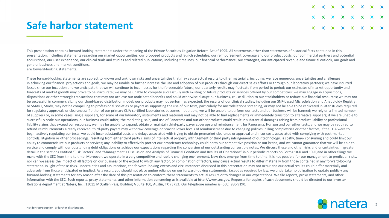 Not for reproduction or further distribution. This presentation contains forward - looking statements under the meaning of the Private Securities Litigation Reform Act of 1995. All statements other than statements of historical facts contained in this presentation, including statements regarding our market opportunities, our proposed products and launch schedules, our reimbu rse ment coverage and our product costs, our commercial partners and potential acquisitions, our user experience, our clinical trials and studies and related publications, including timelines, our financi al performance, our strategies, our anticipated revenue and financial outlook, our goals and general business and market conditions, are forward - looking statements. These forward - looking statements are subject to known and unknown risks and uncertainties that may cause actual results to diffe r materially, including: we face numerous uncertainties and challenges in achieving our financial projections and goals; we may be unable to further increase the use and adoption of our products t hro ugh our direct sales efforts or through our laboratory partners; we have incurred losses since our inception and we anticipate that we will continue to incur losses for the foreseeable future; our quarterly res ults may fluctuate from period to period; our estimates of market opportunity and forecasts of market growth may prove to be inaccurate; we may be unable to compete successfully with existing or future produ cts or services offered by our competitors; we may engage in acquisitions, dispositions or other strategic transactions that may not achieve our anticipated benefits and could otherwise disrupt our bu sin ess, cause dilution to our stockholders or reduce our financial resources; we may not be successful in commercializing our cloud - based distribution model; our products may not perform as expected; the results of ou r clinical studies, including our SNP - based Microdeletion and Aneuploidy Registry, or SMART, Study, may not be compelling to professional societies or payors as supporting the use of our tests, particularly f or microdeletions screening, or may not be able to be replicated in later studies required for regulatory approvals or clearances; if either of our primary CLIA - certified laboratories becomes inoperable, we will be unab le to perform our tests and our business will be harmed; we rely on a limited number of suppliers or, in some cases, single suppliers, for some of our laboratory instruments and materials and may not be able to fi nd replacements or immediately transition to alternative suppliers; if we are unable to successfully scale our operations, our business could suffer; the marketing, sale, and use of Panorama and our other products co uld result in substantial damages arising from product liability or professional liability claims that exceed our resources; we may be unable to expand, obtain or maintain third - party payer coverage and reimbu rsement for Panorama, Horizon and our other tests, and we may be required to refund reimbursements already received; third - party payers may withdraw coverage or provide lower levels of reimbursement due to changing policies, billing complexities or other factors; if the FDA were to begin actively regulating our tests, we could incur substantial costs and delays associated with trying to obtain premarket c lea rance or approval and incur costs associated with complying with post - market controls; litigation or other proceedings, resulting from either third party claims of intellectual property infringement or thi rd party infringement of our technology, is costly, time - consuming and could limit our ability to commercialize our products or services; any inability to effectively protect our proprietary technology could harm ou r competitive position or our brand; and we cannot guarantee that we will be able to service and comply with our outstanding debt obligations or achieve our expectations regarding the conversion of our outstand ing convertible notes. We discuss these and other risks and uncertainties in greater detail in the sections entitled “Risk Factors” and “Management’s Discussion and Analysis of Financial Condition and Results o f O perations” in our periodic reports on Forms 10 - K and 10 - Q and in other filings we make with the SEC from time to time. Moreover, we operate in a very competitive and rapidly changing environment. New risks e mer ge from time to time. It is not possible for our management to predict all risks, nor can we assess the impact of all factors on our business or the extent to which any factor, or combination of factors, may ca use actual results to differ materially from those contained in any forward - looking statement. In light of these risks, uncertainties and assumptions, the forward - looking events and circumstances discussed in thi s presentation may not occur and our actual results could differ materially and adversely from those anticipated or implied. As a result, you should not place undue reliance on our forward - looking statements. Except as required by law, we undertake no obligation to update publicly any forward - looking statements for any reason after the date of this presentation to conform these statements to actual results or t o changes in our expectations. We file reports, proxy statements, and other information with the SEC. Such reports, proxy statements, and other information concerning us is available at http:// www.sec.gov . Requests for copies of such documents should be directed to our Investor Relations department at Natera , Inc., 13011 McCallen Pass, Building A Suite 100, Austin, TX 78753. Our telephone number is (650) 980 - 9190. 2 Safe harbor statement