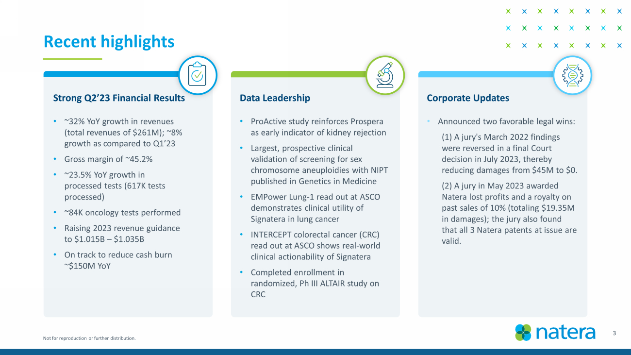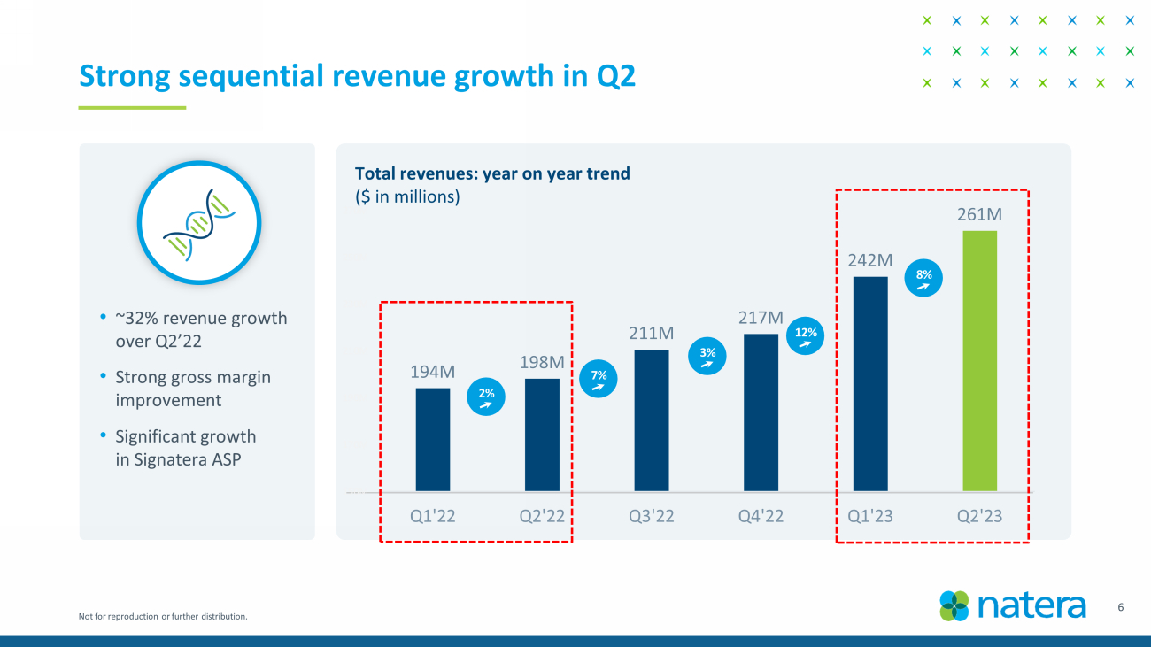 Not for reproduction or further distribution. 194M 198M 211M 217M 242M 261M 150M 170M 190M 210M 230M 250M 270M Q1'22 Q2'22 Q3'22 Q4'22 Q1'23 Q2'23 Strong sequential revenue growth in Q2 • ~32% revenue growth over Q2’22 • Strong gross margin improvement • Significant growth in Signatera ASP Total revenues: year on year trend ($ in millions) 2 % 7 % 3 % 12 % 8 % 6