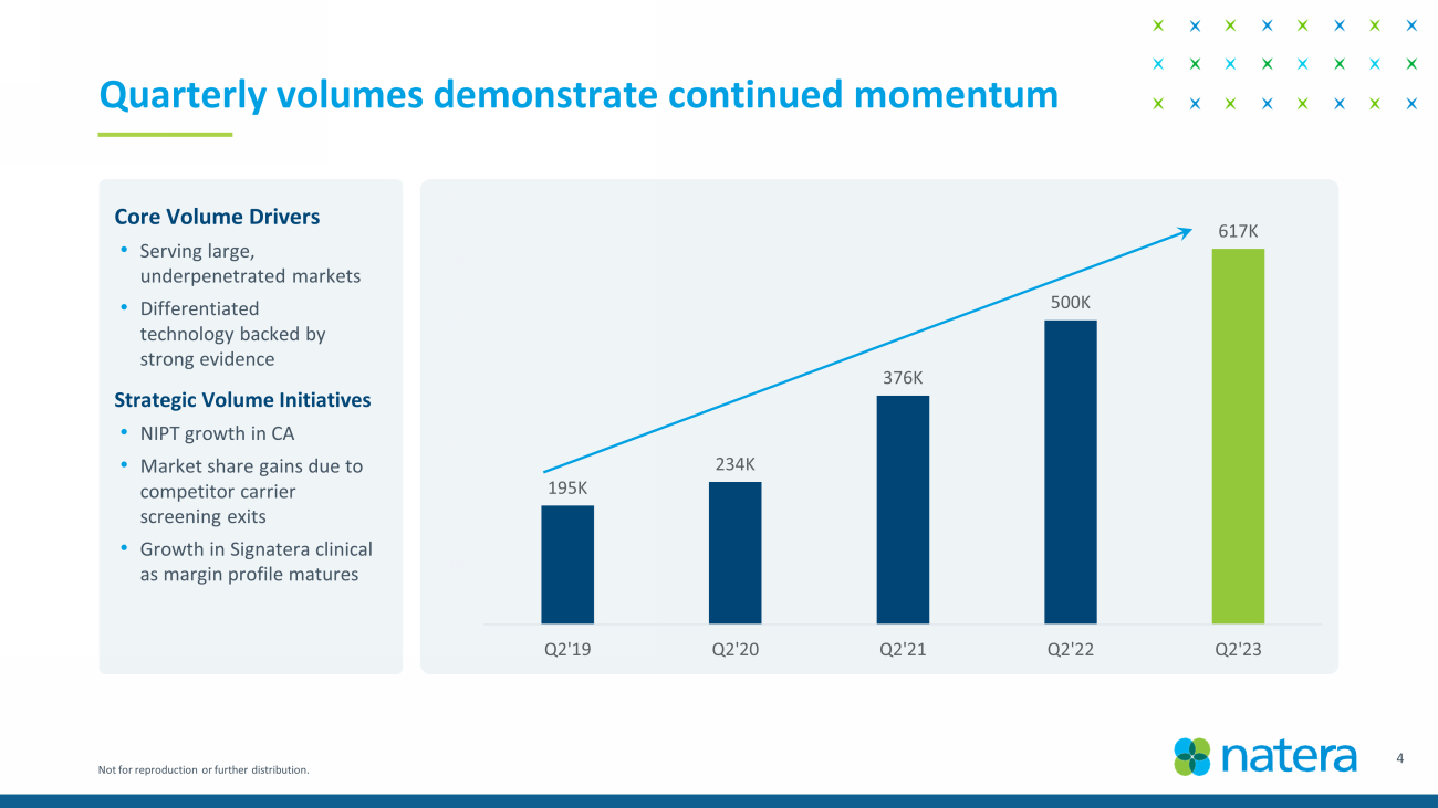 Not for reproduction or further distribution. Recent highlights Strong Q2’23 Financial Results Data Leadership Corporate Updates • ProActive study reinforces Prospera as early indicator of kidney rejection • Largest, prospective clinical validation of screening for sex chromosome aneuploidies with NIPT published in Genetics in Medicine • EMPower Lung - 1 read out at ASCO demonstrates clinical utility of Signatera in lung cancer • INTERCEPT colorectal cancer (CRC) read out at ASCO shows real - world clinical actionability of Signatera • Completed enrollment in randomized, Ph III ALTAIR study on CRC • ~32 % YoY growth in revenues (total revenues of $261M); ~8% growth as compared to Q1’23 • Gross margin of ~ 45.2% • ~ 23.5% YoY growth in processed tests (617K tests processed) • ~84K oncology tests performed • Raising 2023 revenue guidance to $1.015B – $1.035B • O n track to reduce cash burn ~$150M YoY • Announced two favorable legal wins: (1) A jury's March 2022 findings were reversed in a final Court decision in July 2023, thereby reducing damages from $45M to $0. (2) A jury in May 2023 awarded Natera lost profits and a royalty on past sales of 10% (totaling $19.35M in damages); the jury also found that all 3 Natera patents at issue are valid. 3