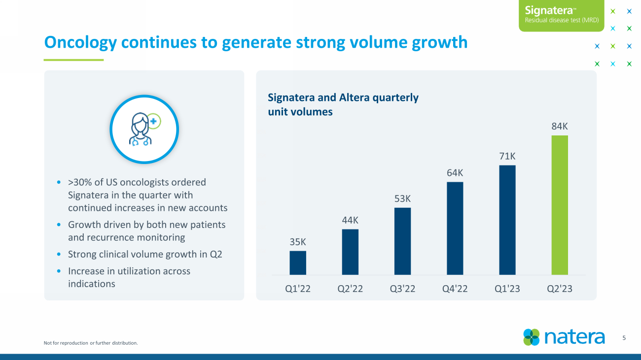 Not for reproduction or further distribution. Quarterly volumes demonstrate continued momentum Core Volume Drivers • Serving large, underpenetrated markets • Differentiated technology backed by strong evidence Strategic Volume Initiatives • NIPT growth in CA • Market share gains due to competitor carrier screening exits • Growth in Signatera clinical as margin profile matures 195K 234K 376K 500K 617K 0K 100K 200K 300K 400K 500K 600K 700K Q2'19 Q2'20 Q2'21 Q2'22 Q2'23 4