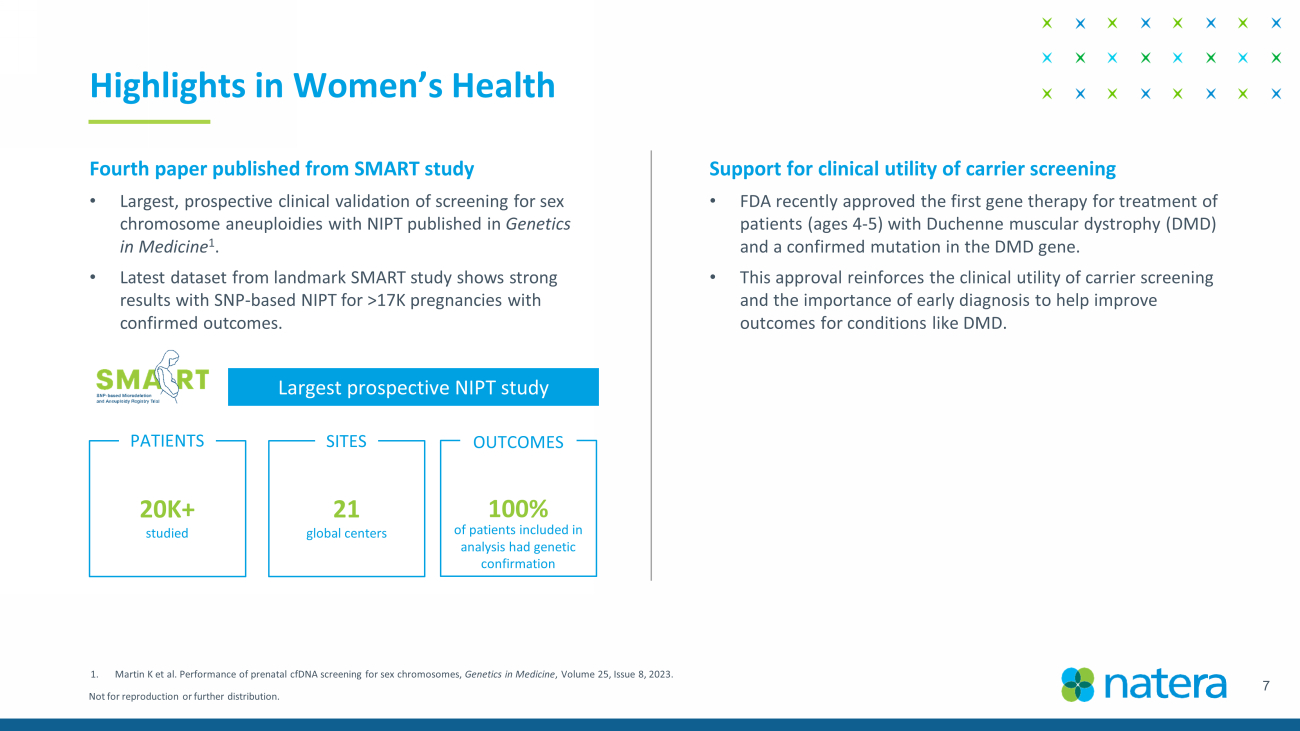 Not for reproduction or further distribution. Fourth paper published from SMART study • Largest, prospective clinical validation of screening for sex chromosome aneuploidies with NIPT published in Genetics in Medicine 1 . • Latest dataset from landmark SMART study shows strong results with SNP - based NIPT for >17K pregnancies with confirmed outcomes. 7 Highlights in Women’s Health 1. Martin K et al. Performance of prenatal cfDNA screening for sex chromosomes, Genetics in Medicine , Volume 25, Issue 8, 2023. 20K+ 21 100 % PATIENTS SITES OUTCOMES studied global centers of patients included in analysis had genetic confirmation Largest prospective NIPT study Support for clinical utility of carrier screening • FDA recently approved the first gene therapy for treatment of patients (ages 4 - 5) with Duchenne muscular dystrophy (DMD) and a confirmed mutation in the DMD gene. • This approval reinforces the clinical utility of carrier screening and the importance of early diagnosis to help improve outcomes for conditions like DMD.