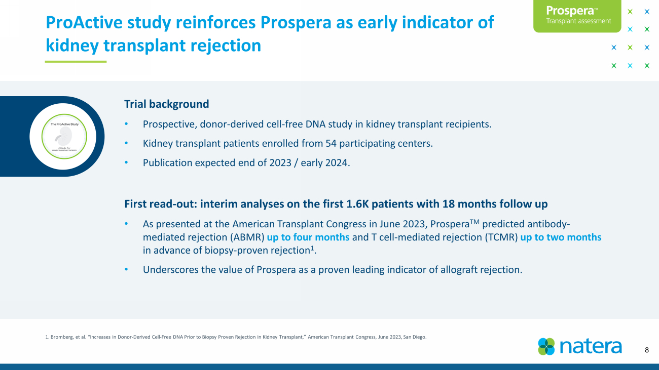 Trial background • Prospective, donor - derived cell - free DNA study in kidney transplant recipients. • Kidney transplant patients enrolled from 54 participating centers. • Publication expected end of 2023 / early 2024. First read - out: interim analyses on the first 1.6K patients with 18 months follow up • As presented at the American Transplant Congress in June 2023, Prospera TM predicted antibody - mediated rejection (ABMR) up to four months and T cell - mediated rejection (TCMR) up to two months in advance of biopsy - proven rejection 1 . • Underscores the value of Prospera as a proven leading indicator of allograft rejection. ProActive study reinforces Prospera as early indicator of kidney transplant rejection 1. Bromberg, et al. “Increases in Donor - Derived Cell - Free DNA Prior to Biopsy Proven Rejection in Kidney Transplant,” American T ransplant Congress, June 2023, San Diego. 8