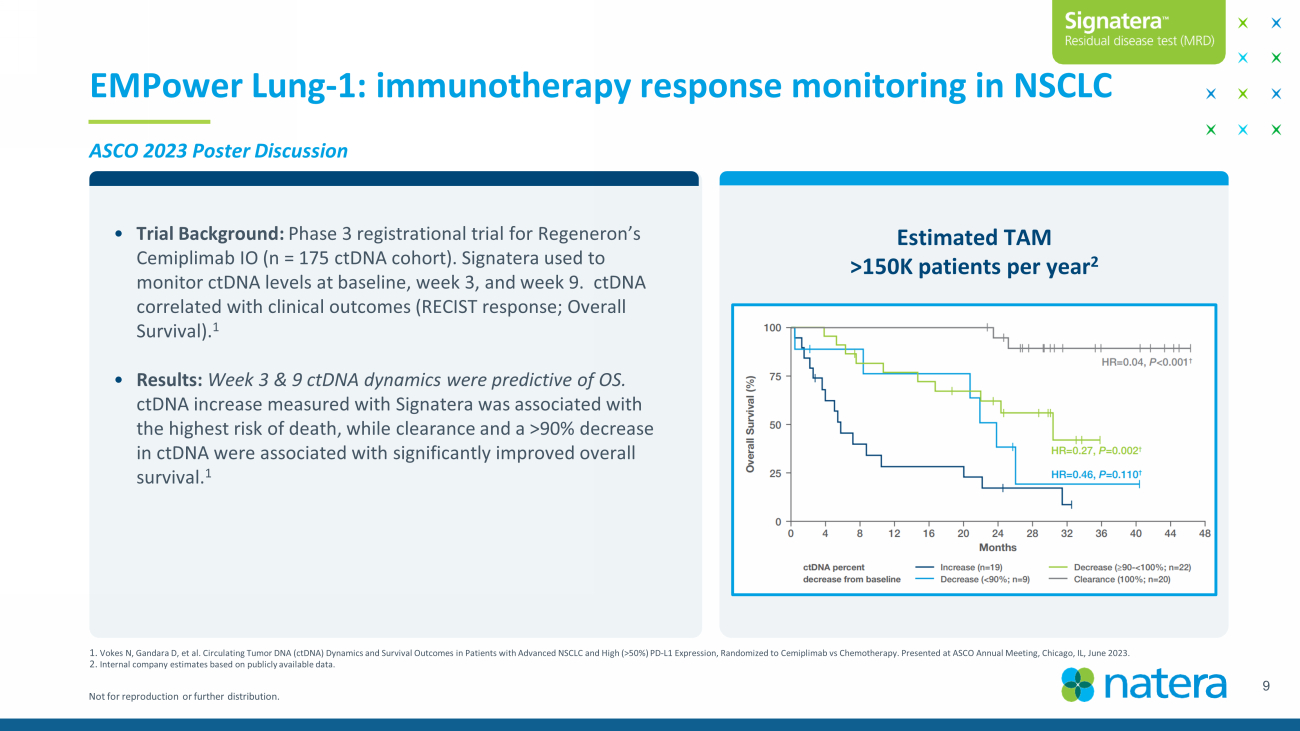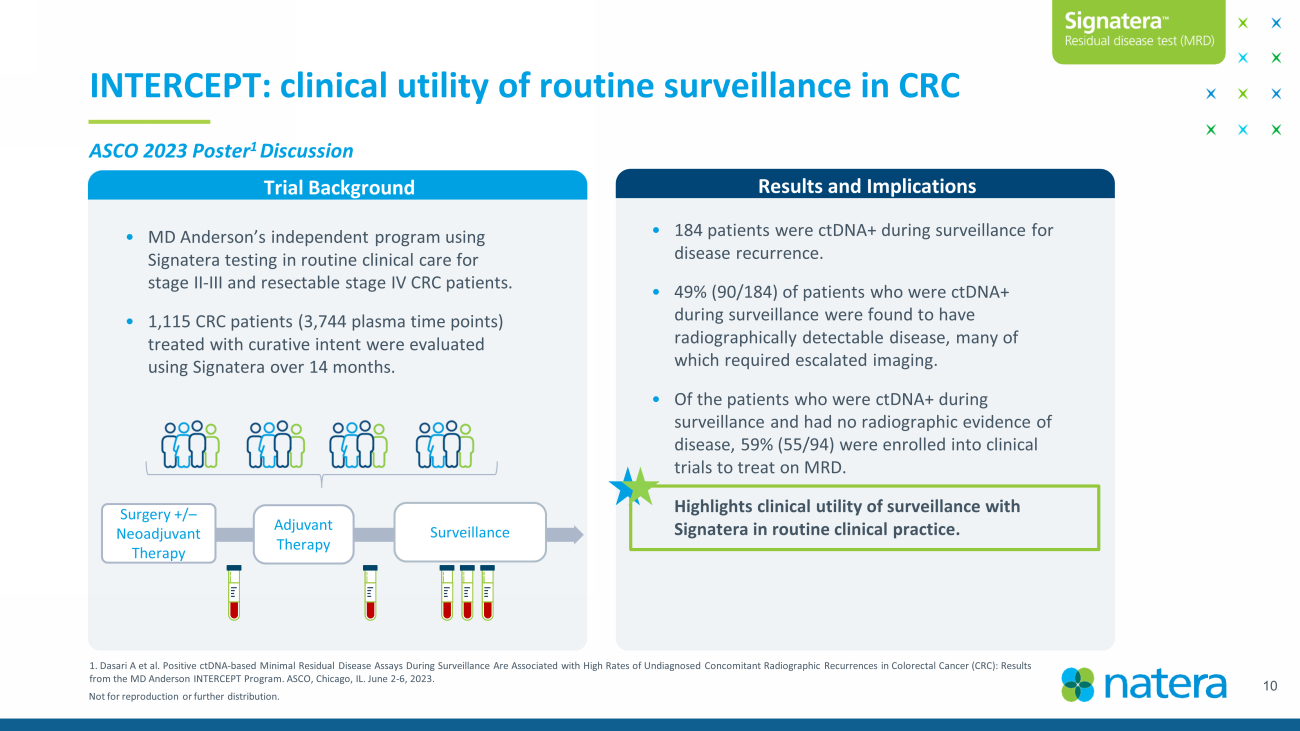Not for reproduction or further distribution. • Trial Background: Phase 3 registrational trial for Regeneron’s Cemiplimab IO (n = 175 ctDNA cohort). Signatera used to monitor ctDNA levels at baseline, week 3, and week 9. ctDNA correlated with clinical outcomes (RECIST response; Overall Survival). 1 • Results: Week 3 & 9 ctDNA dynamics were predictive of OS. ctDNA increase measured with Signatera was associated with the highest risk of death, while clearance and a >90% decrease in ctDNA were associated with significantly improved overall survival. 1 Estimated TAM >150K patients per year 2 EMPower Lung - 1: immunotherapy response monitoring in NSCLC 1. Vokes N, Gandara D, et al. Circulating Tumor DNA (ctDNA) Dynamics and Survival Outcomes in Patients with Advanced NSCLC and High (> 50 %) PD - L1 Expression, Randomized to Cemiplimab vs Chemotherapy. Presented at ASCO Annual Meeting, Chicago, IL, June 2023. 2. Internal company estimates based on publicly available data. ASCO 2023 Poster Discussion 9